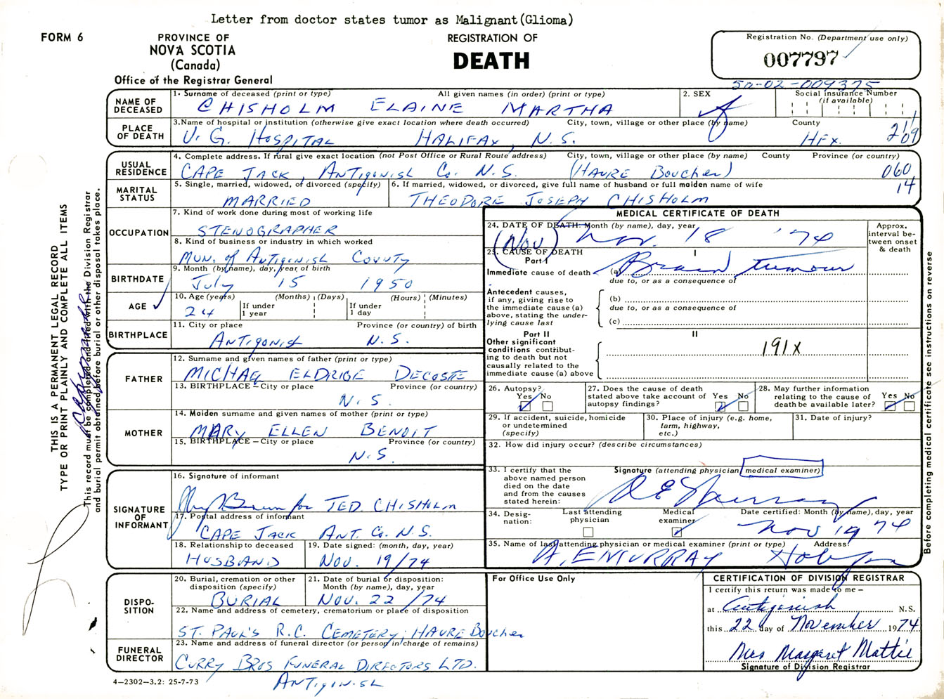 Female Death Registration: Year: 1974 number: 7797
