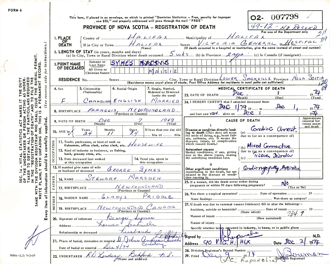 Female Death Registration: Year: 1974 number: 7798