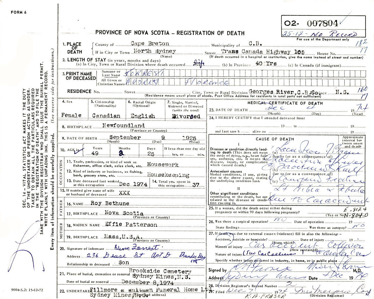 Female Death Registration: Year: 1974 number: 7804