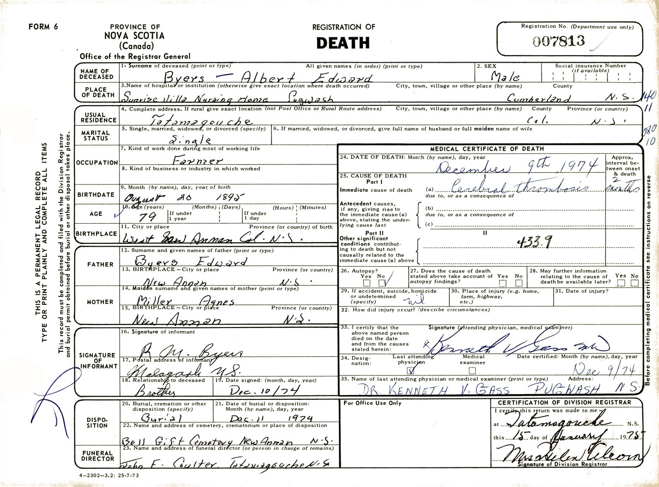 Male Death Registration: Year: 1974 number: 7813