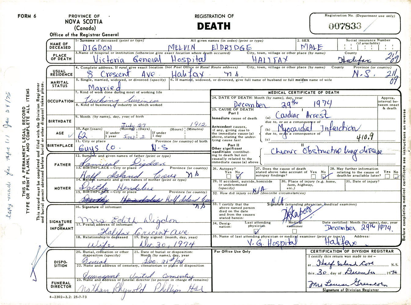 Male Death Registration: Year: 1974 number: 7833