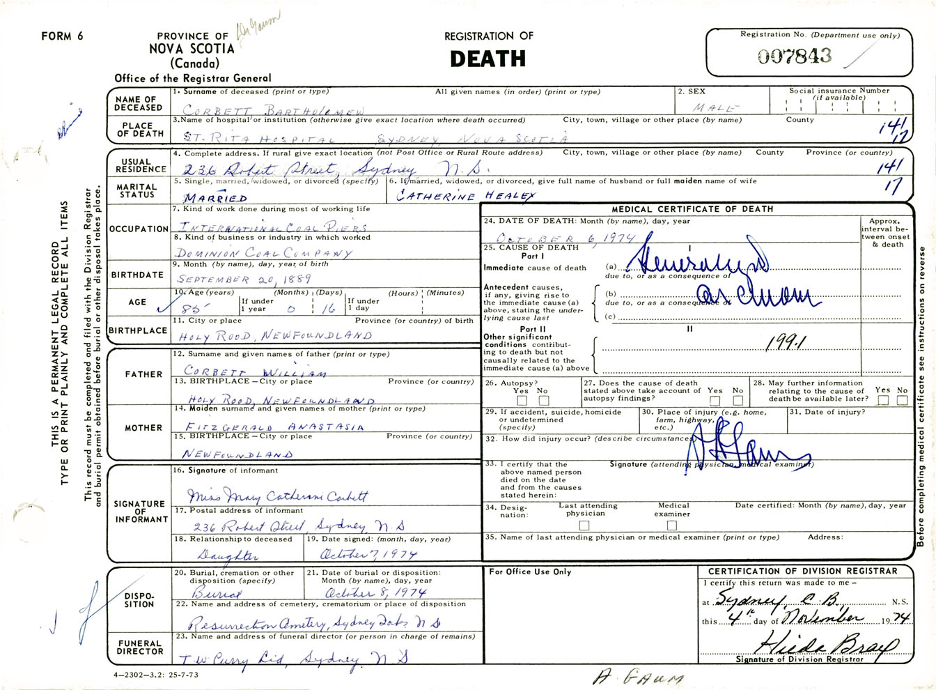 Male Death Registration: Year: 1974 number: 7843