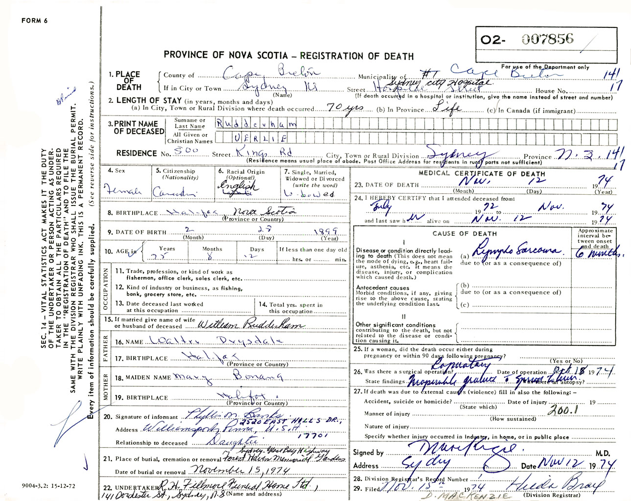 Female Death Registration: Year: 1974 number: 7856