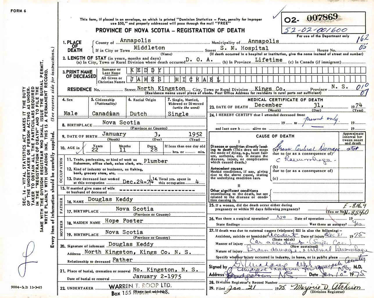 Male Death Registration: Year: 1974 number: 7869
