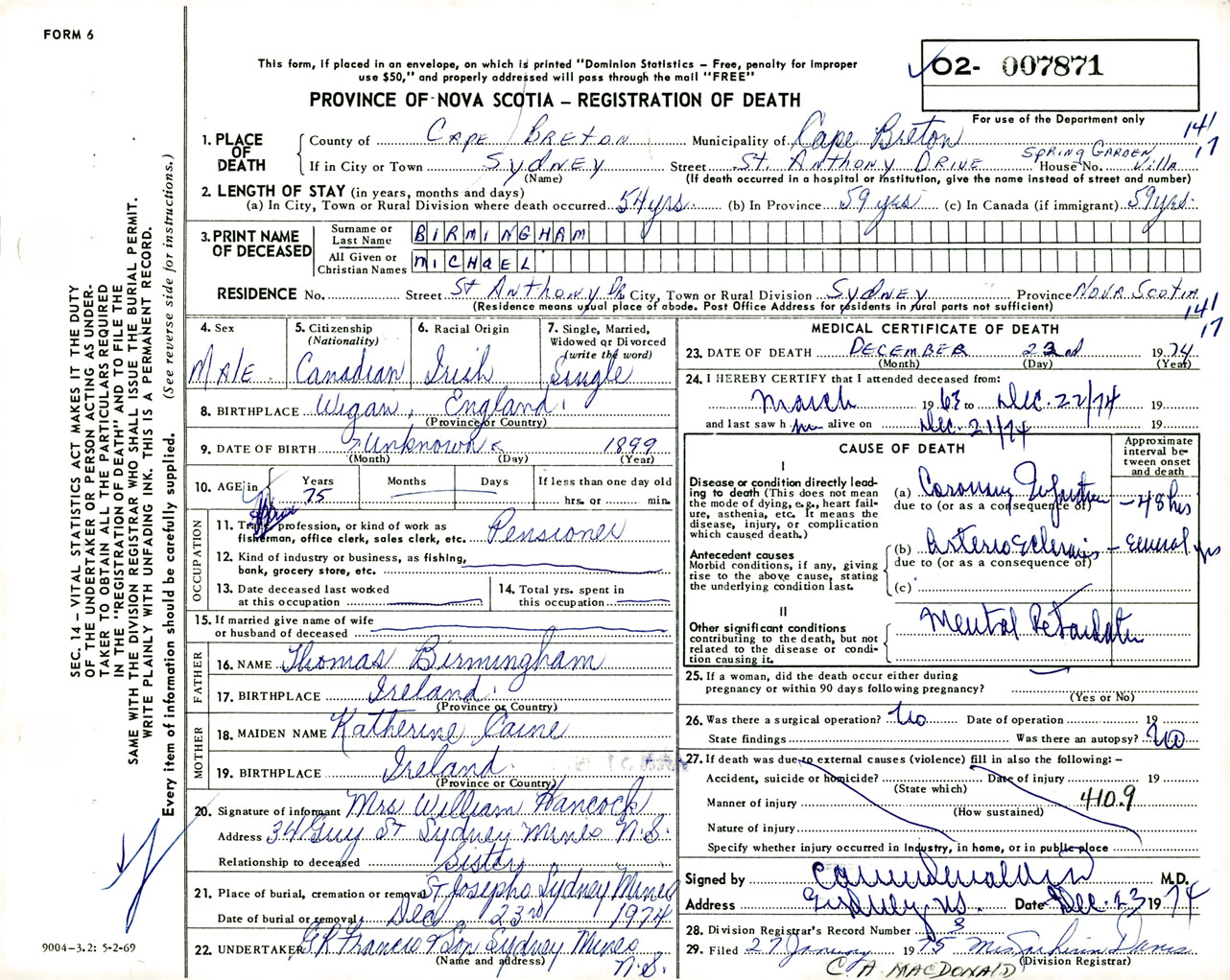 Male Death Registration: Year: 1974 number: 7871