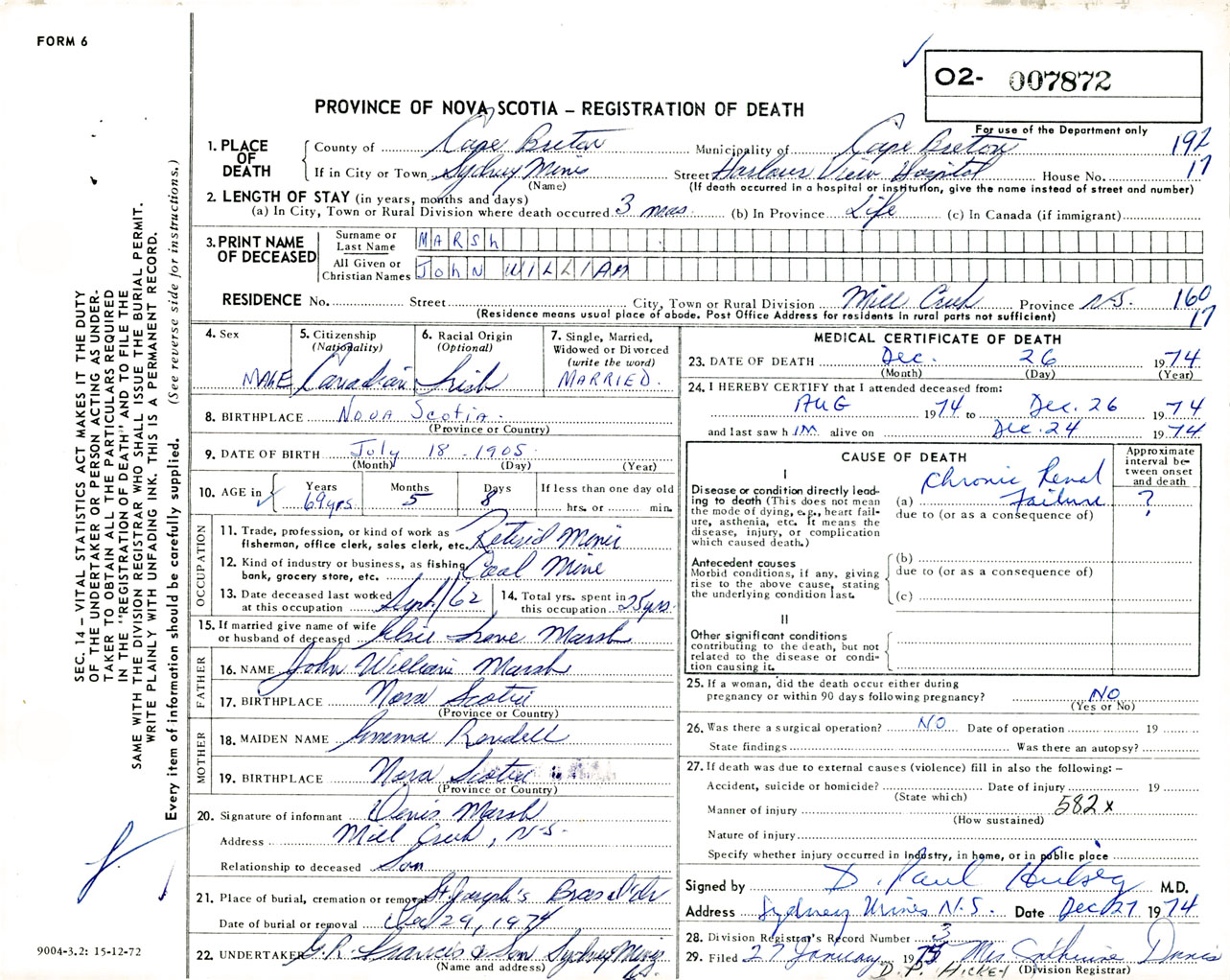 Male Death Registration: Year: 1974 number: 7872
