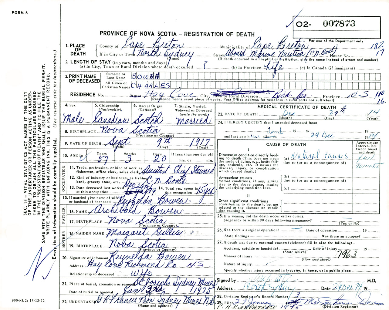 Male Death Registration: Year: 1974 number: 7873