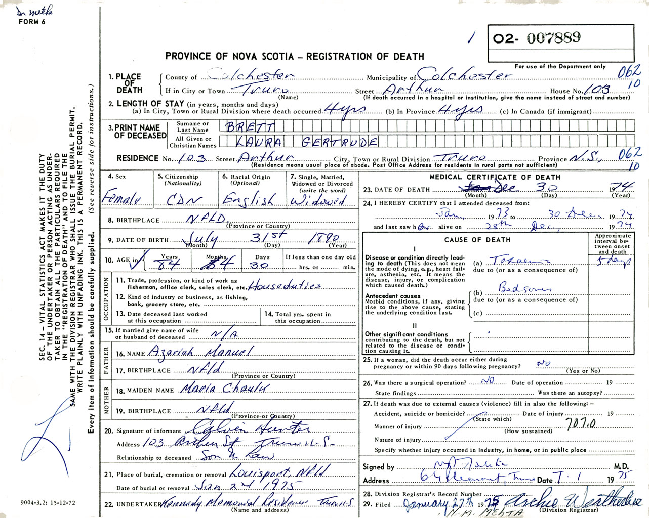 Female Death Registration: Year: 1974 number: 7889