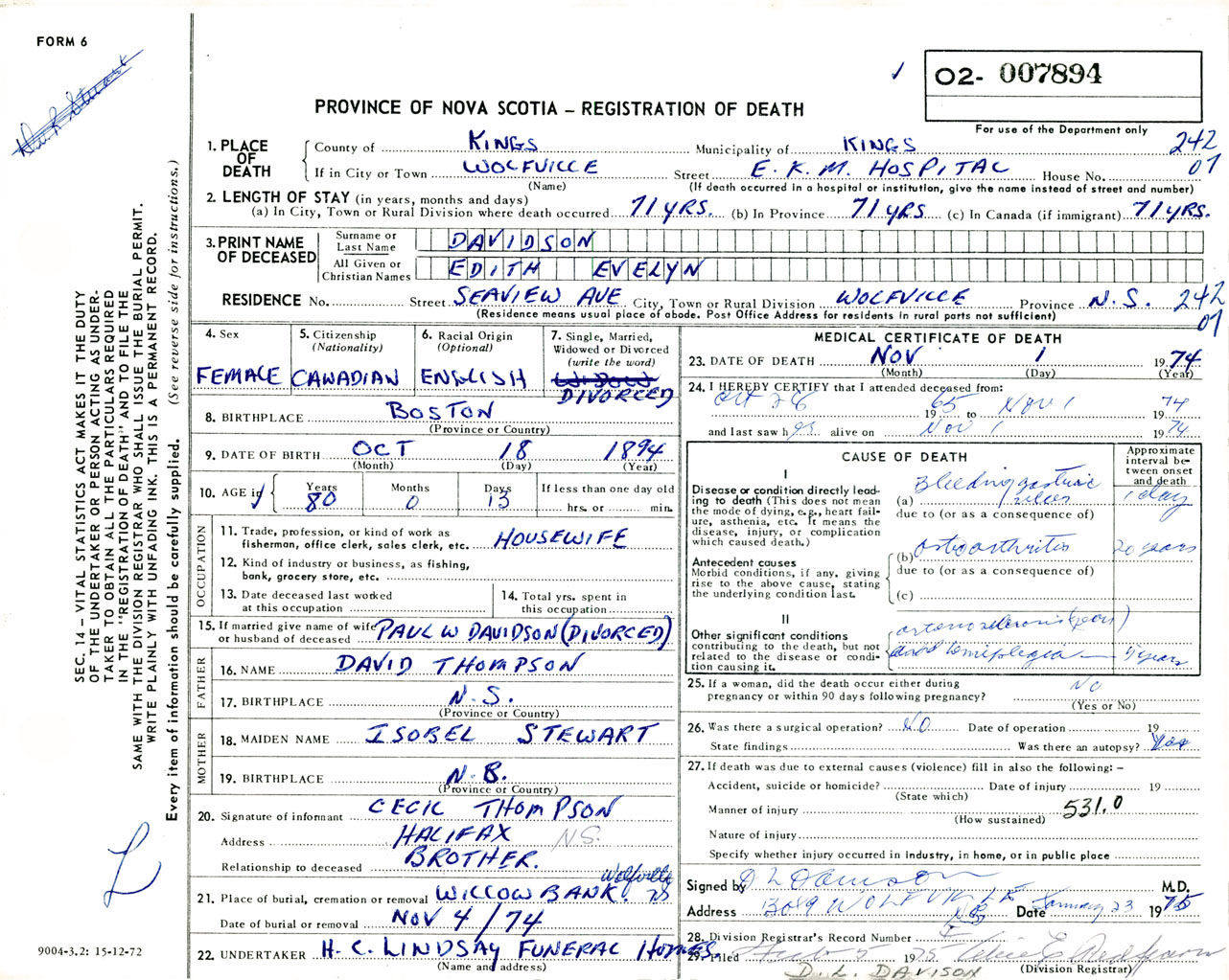 Female Death Registration: Year: 1974 number: 7894