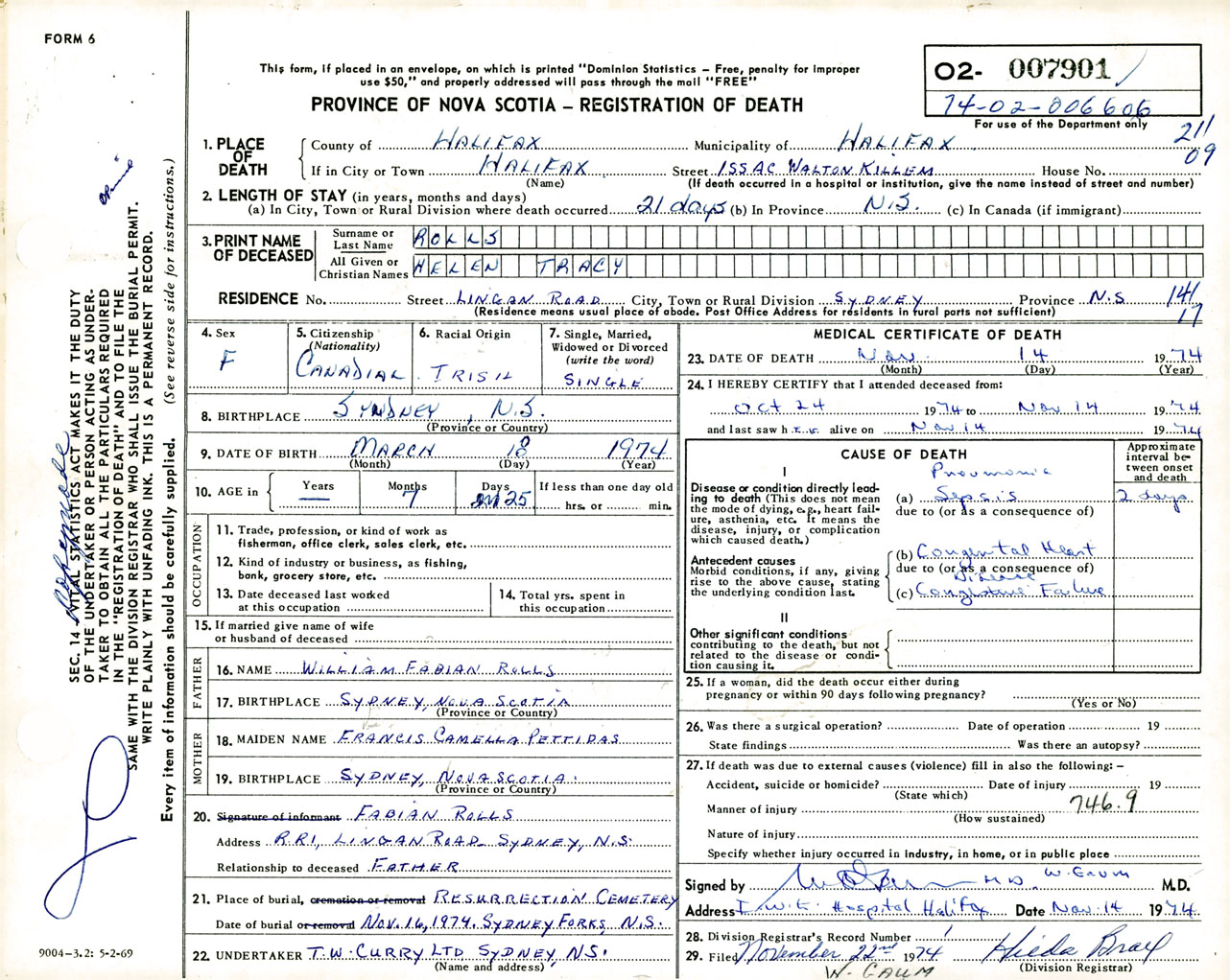 Female Death Registration: Year: 1974 number: 7901
