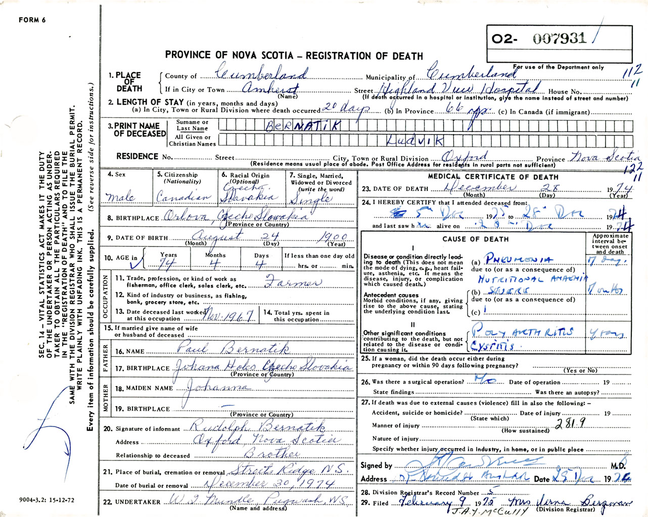 Male Death Registration: Year: 1974 number: 7931