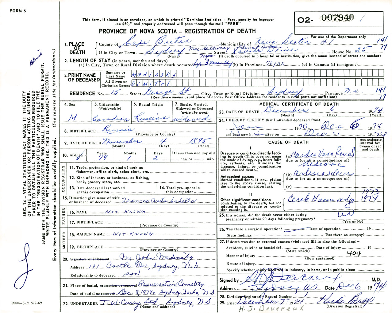 Male Death Registration: Year: 1974 number: 7940