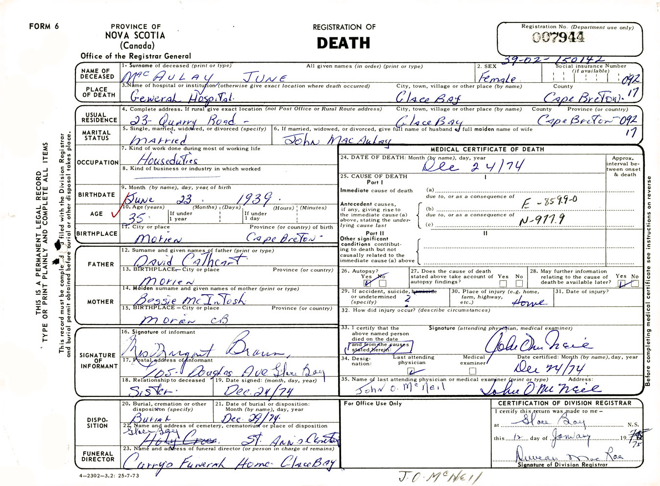 Female Death Registration: Year: 1974 number: 7944