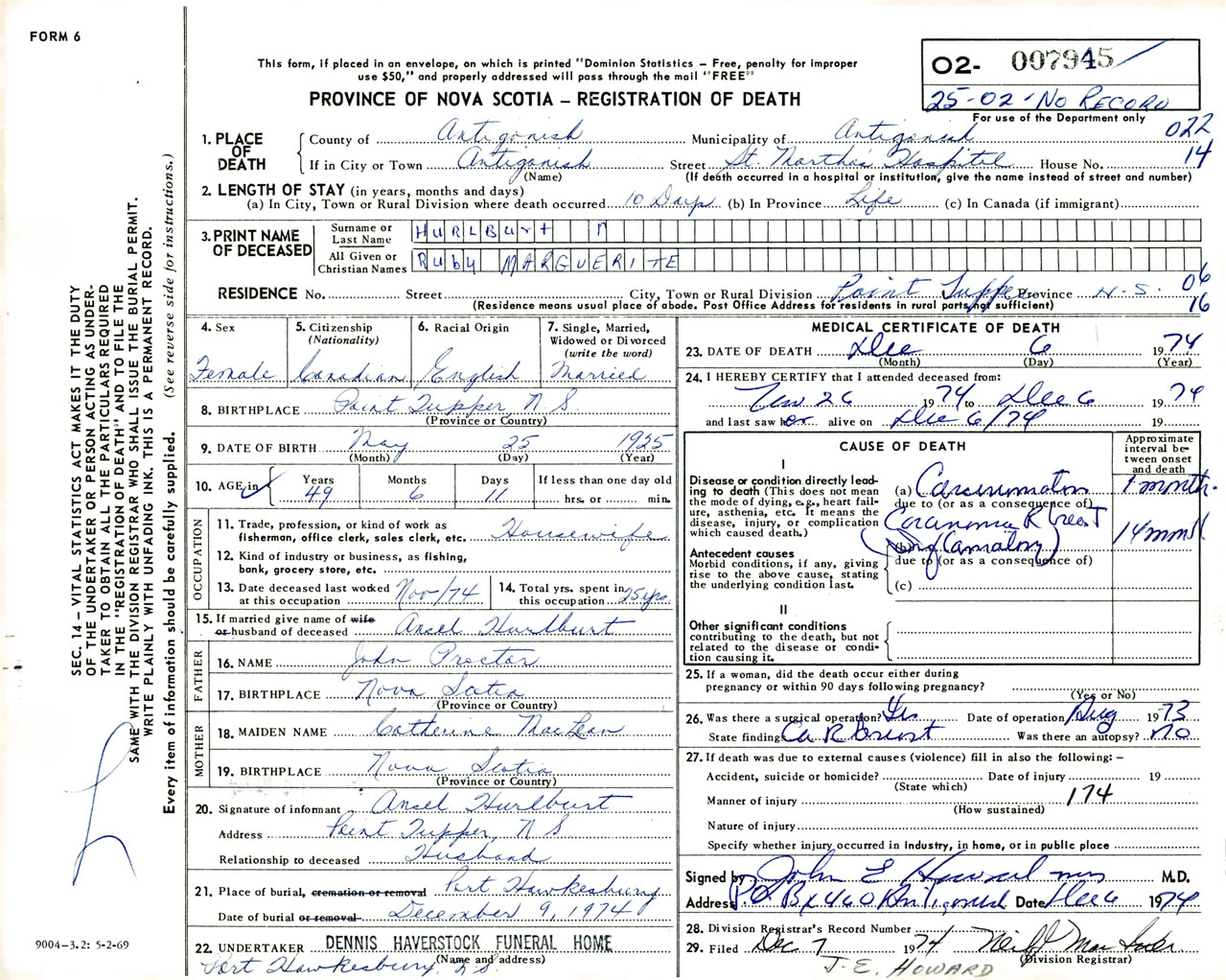 Female Death Registration: Year: 1974 number: 7945