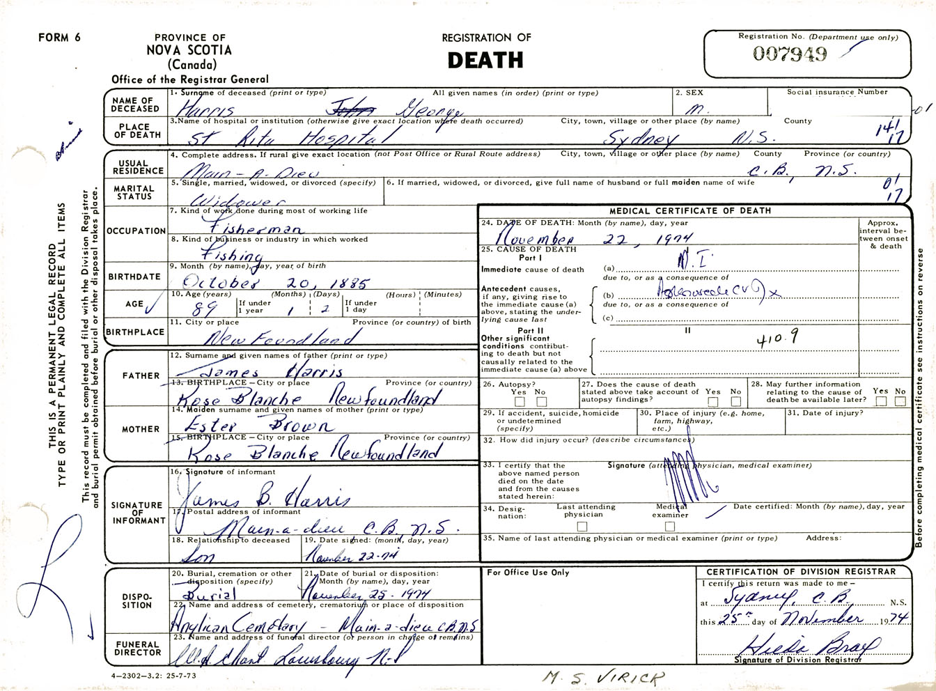 Male Death Registration: Year: 1974 number: 7949