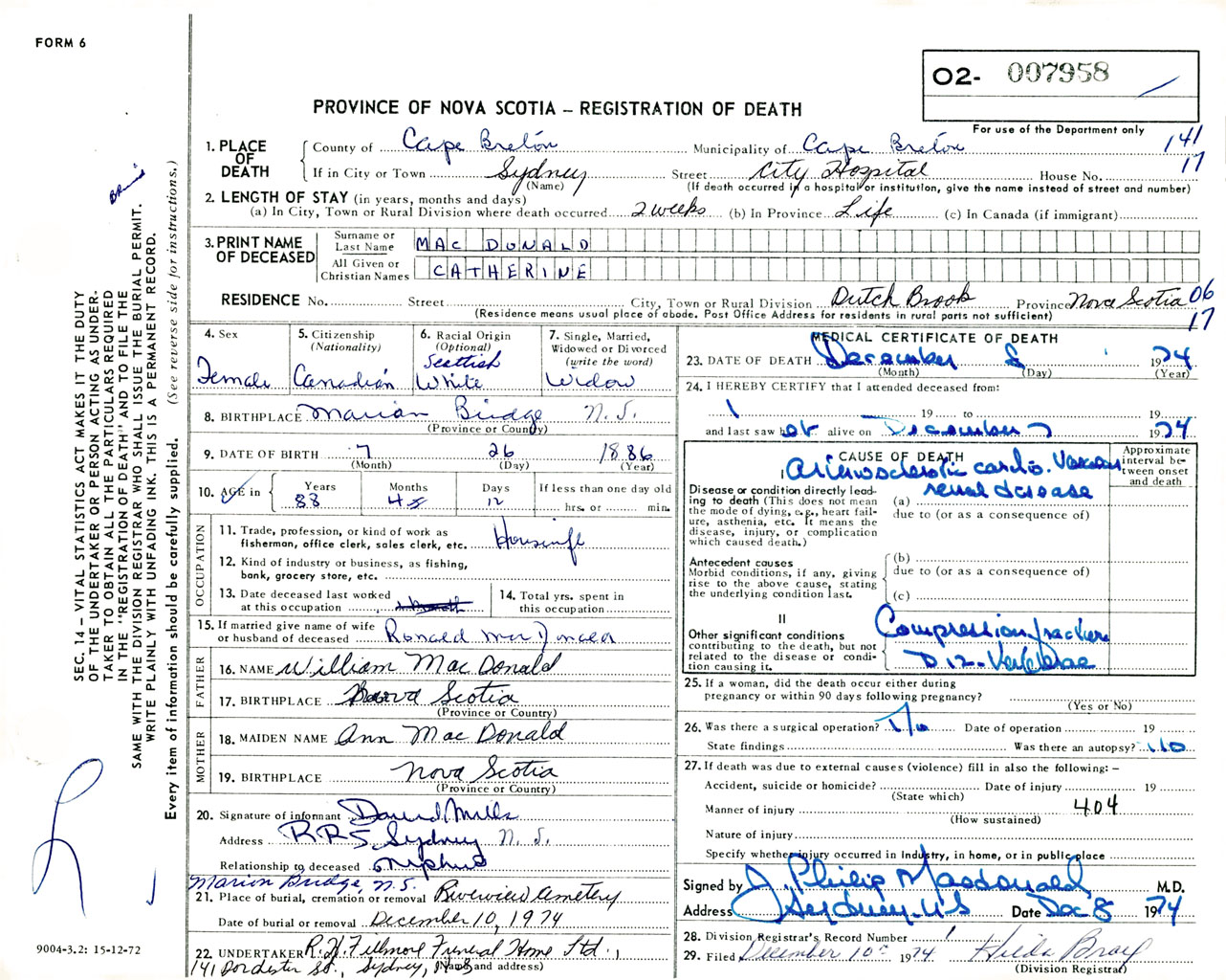 Female Death Registration: Year: 1974 number: 7958