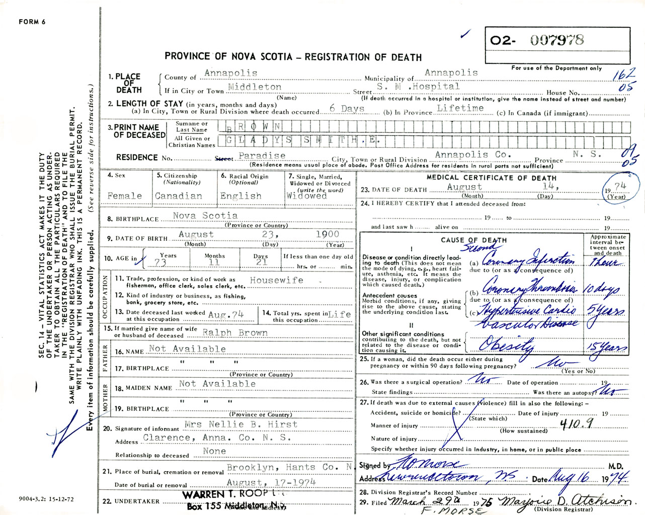Female Death Registration: Year: 1974 number: 7978