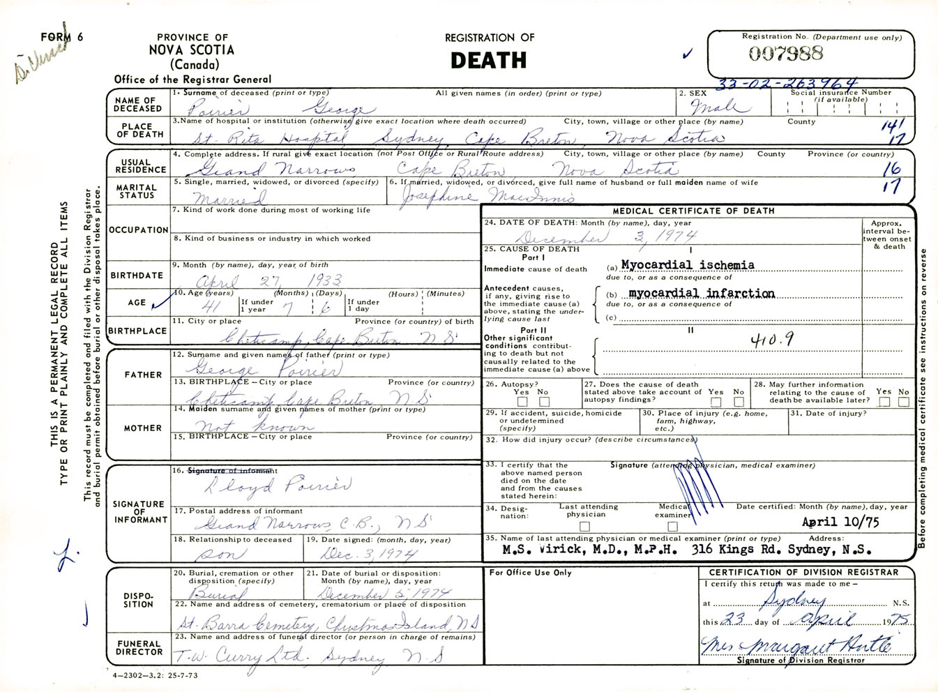 Male Death Registration: Year: 1974 number: 7988