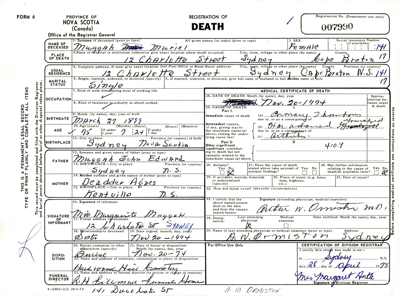 Female Death Registration: Year: 1974 number: 7990