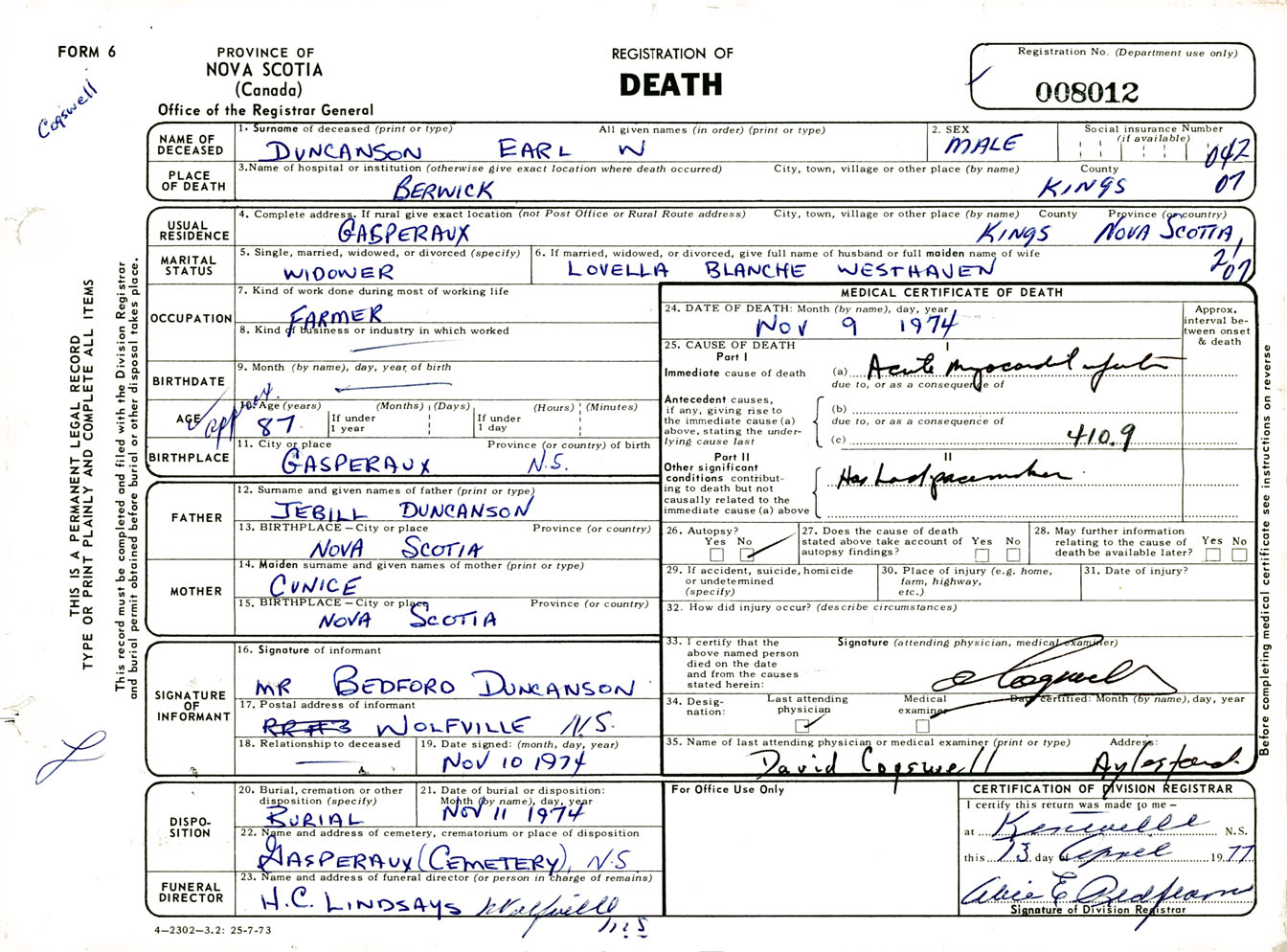 Male Death Registration: Year: 1974 number: 8012