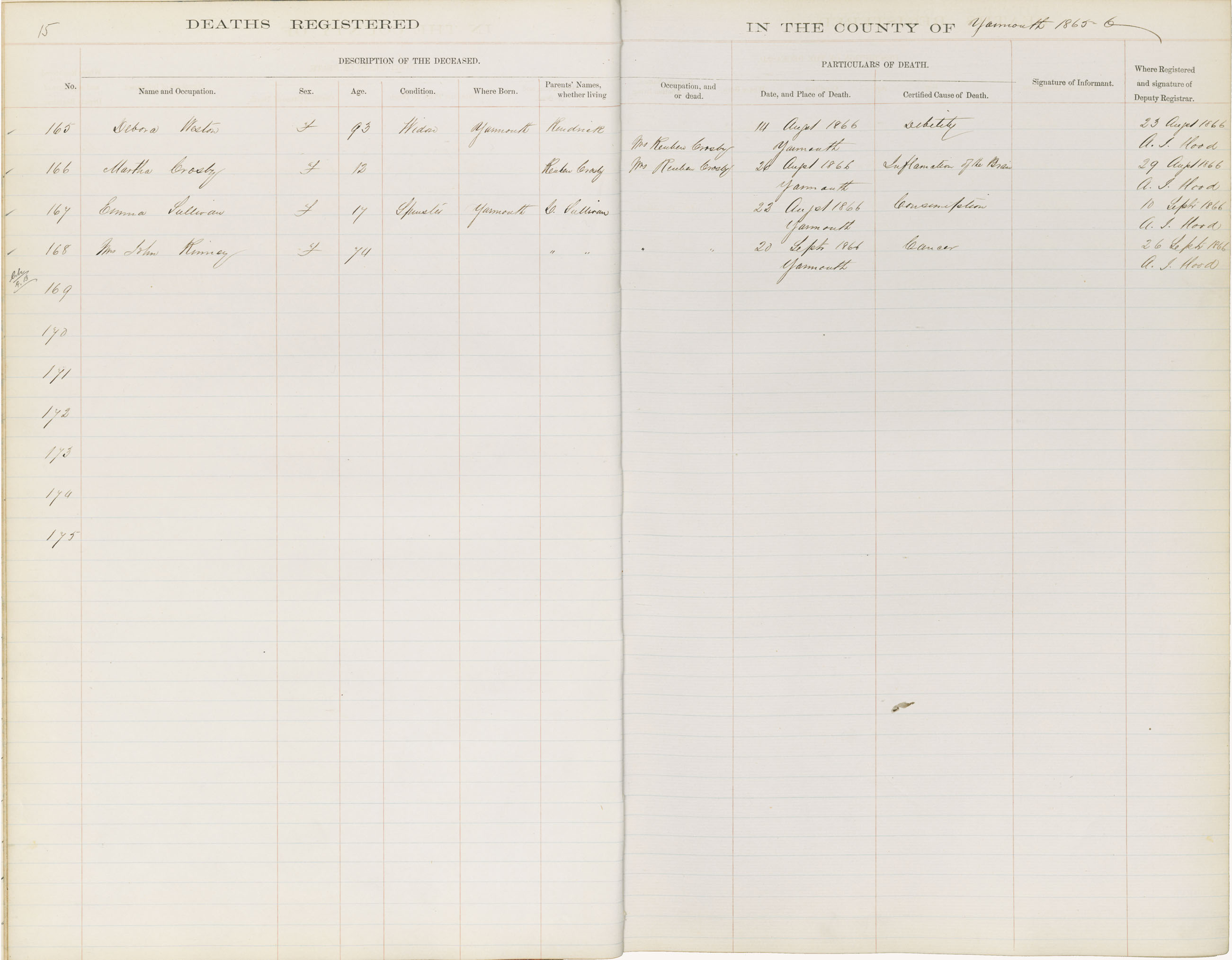 Death Registration: Year: 1866 book: 1818 page: 15 number: 168