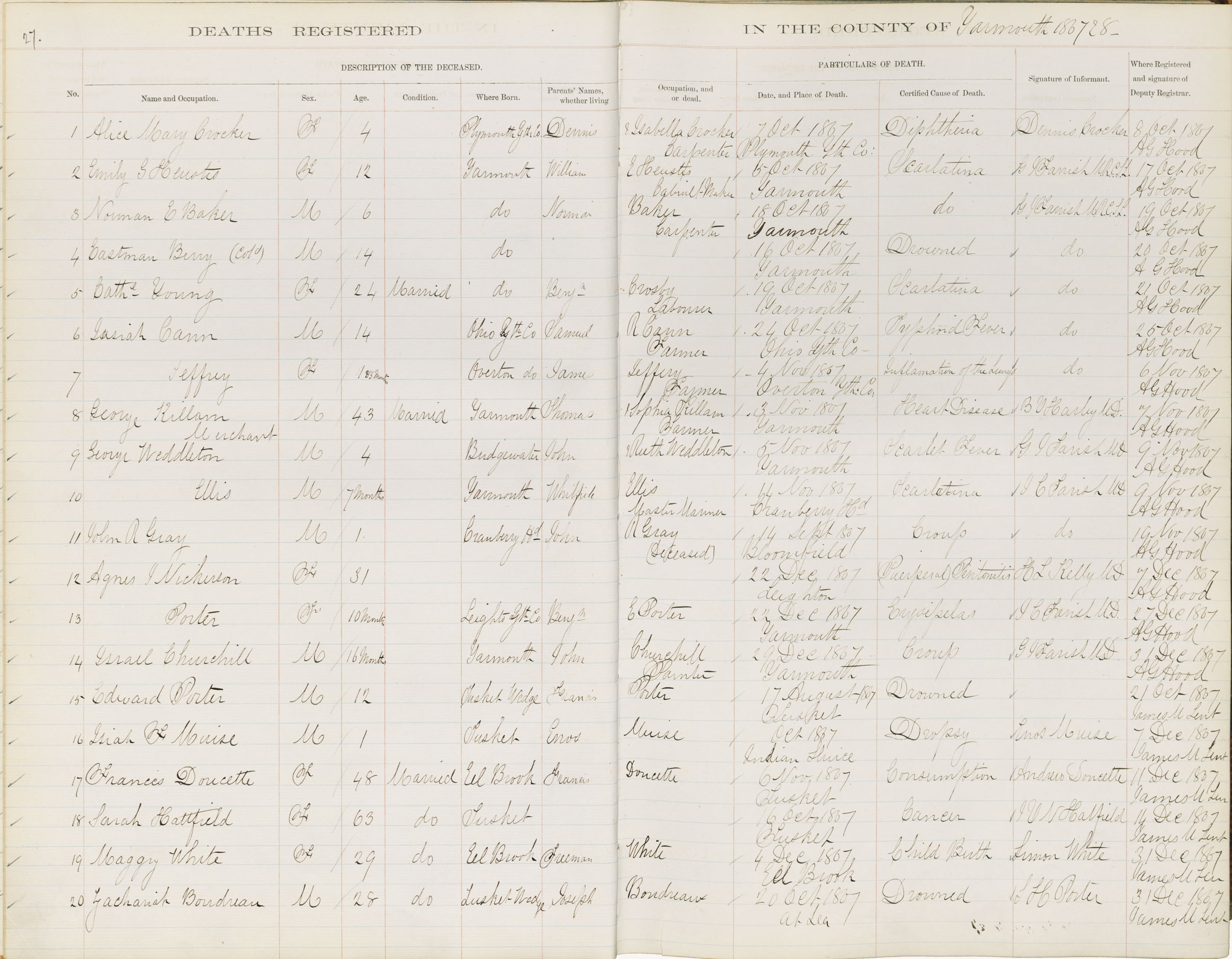 Death Registration: Year: 1867 book: 1818 page: 27 number: 20