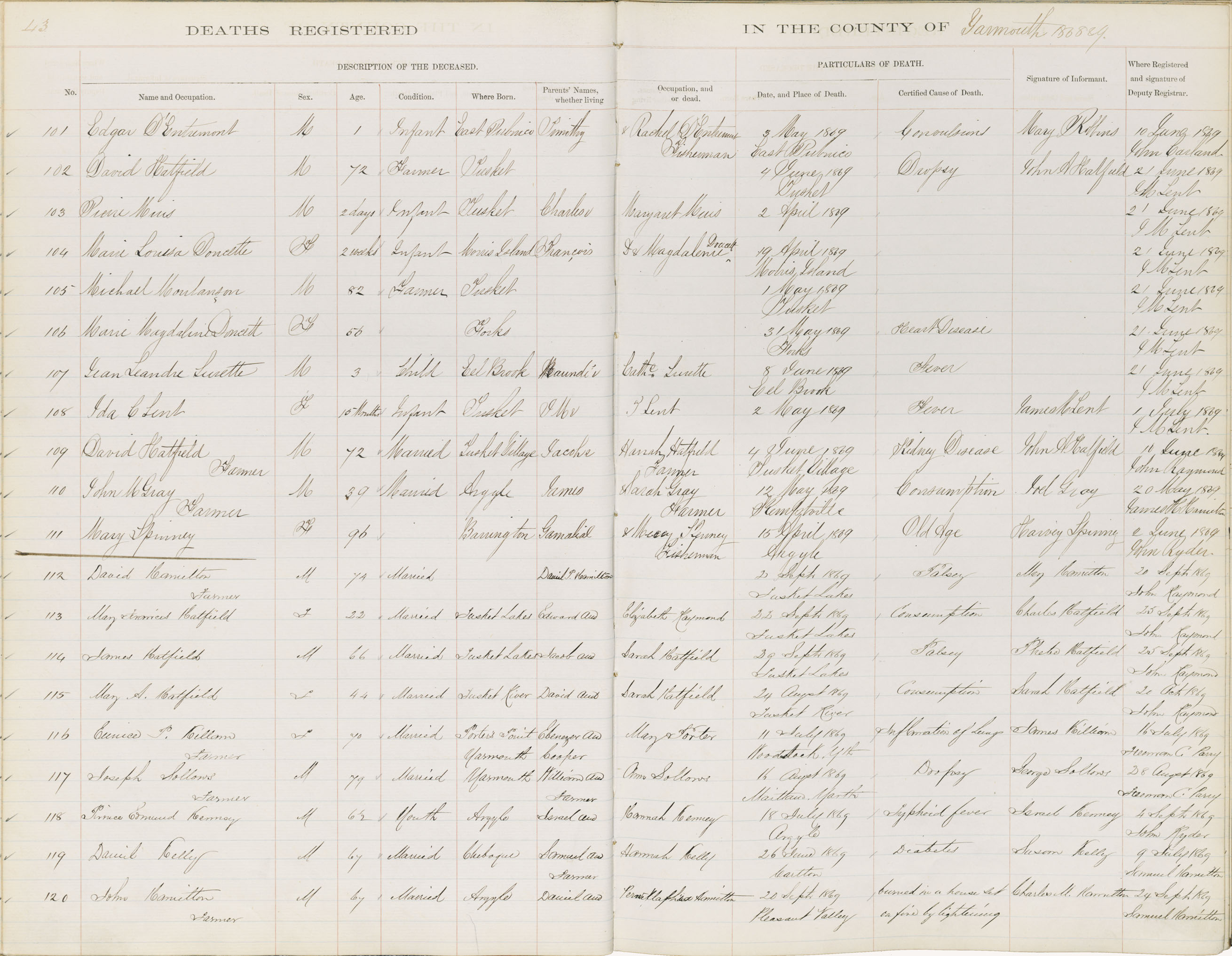 Death Registration: Year: 1869 book: 1818 page: 43 number: 101