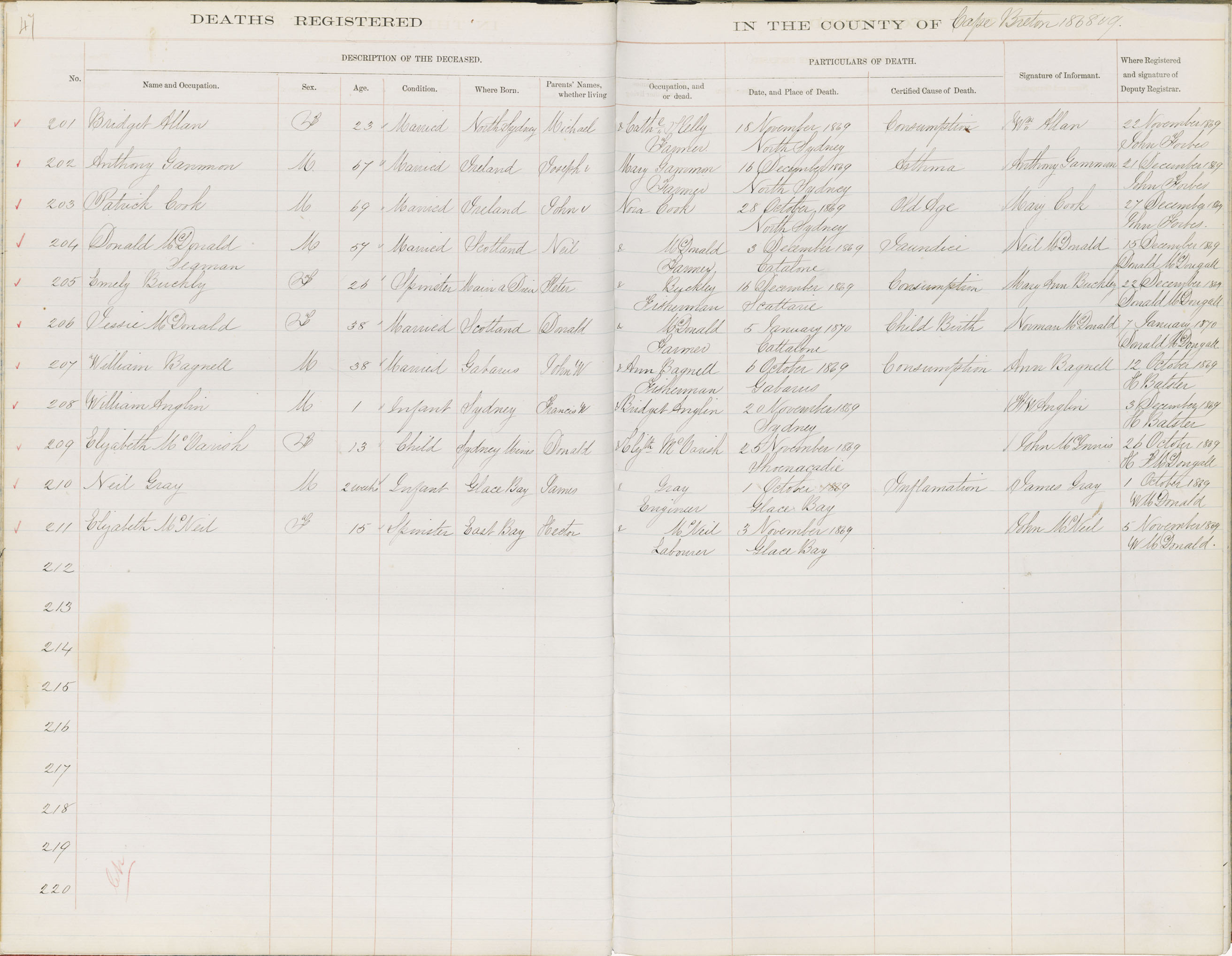 Death Registration: Year: 1869 book: 1803 page: 47 number: 201