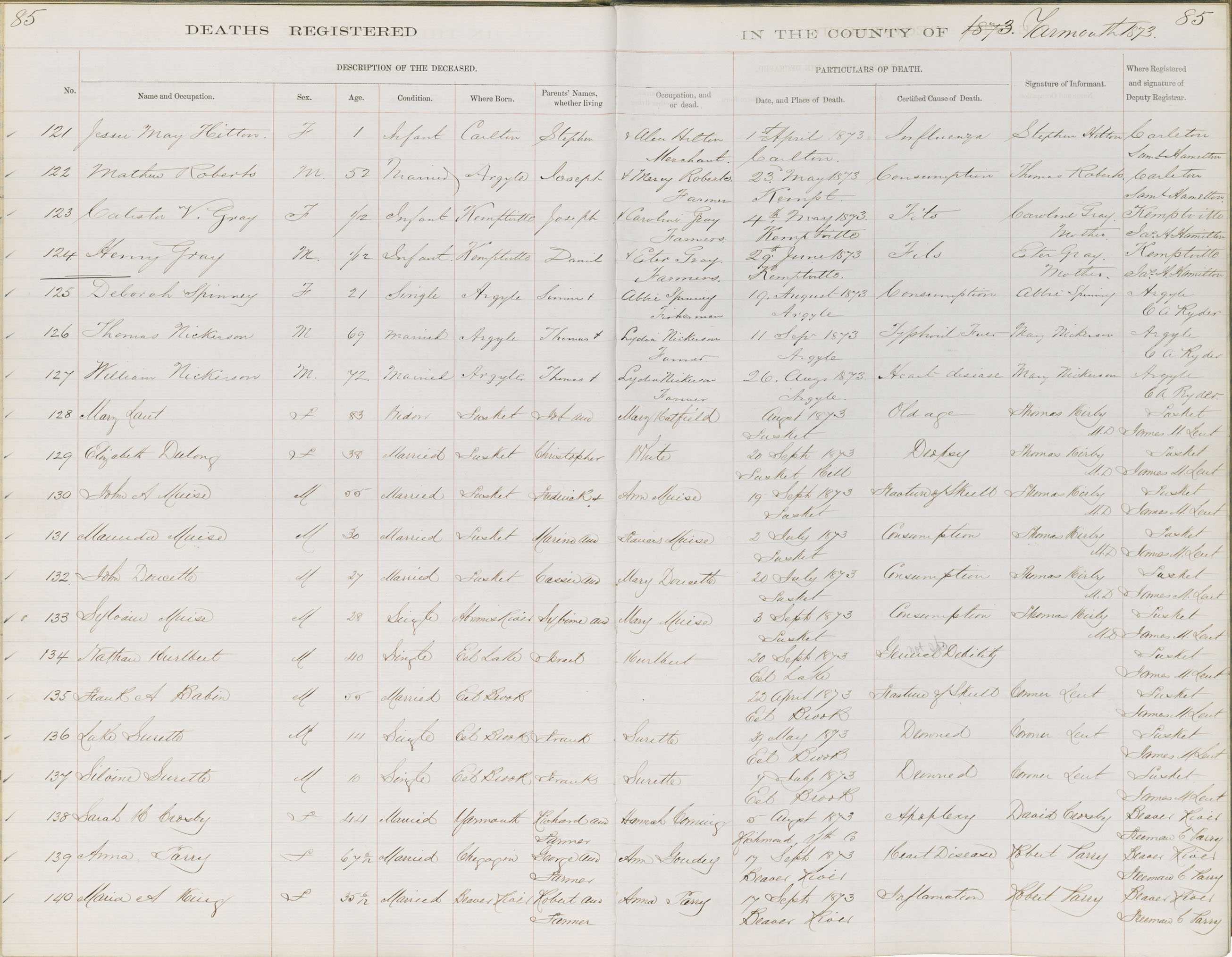 Death Registration: Year: 1873 book: 1818 page: 85 number: 121