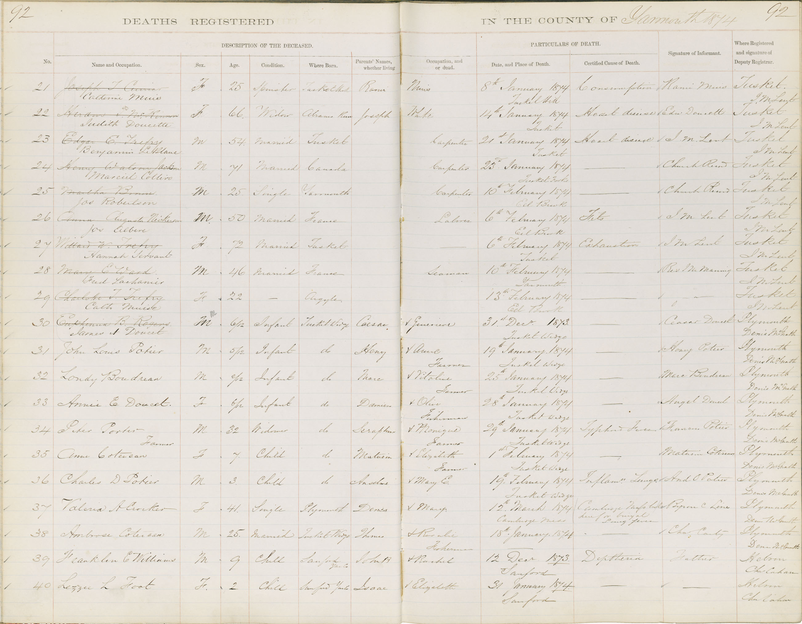 Death Registration: Year: 1874 book: 1818 page: 92 number: 40