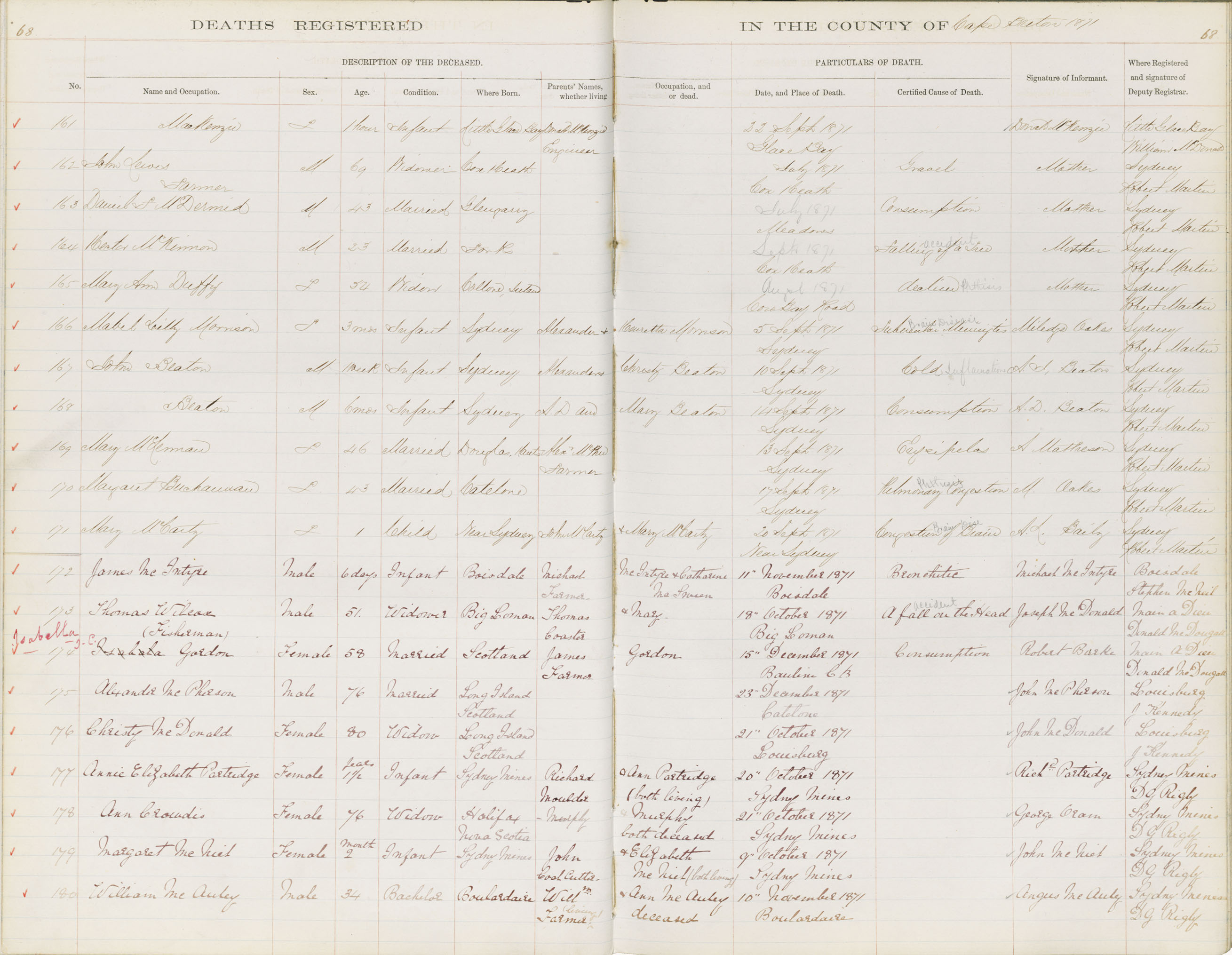Death Registration: Year: 1871 book: 1803 page: 68 number: 161