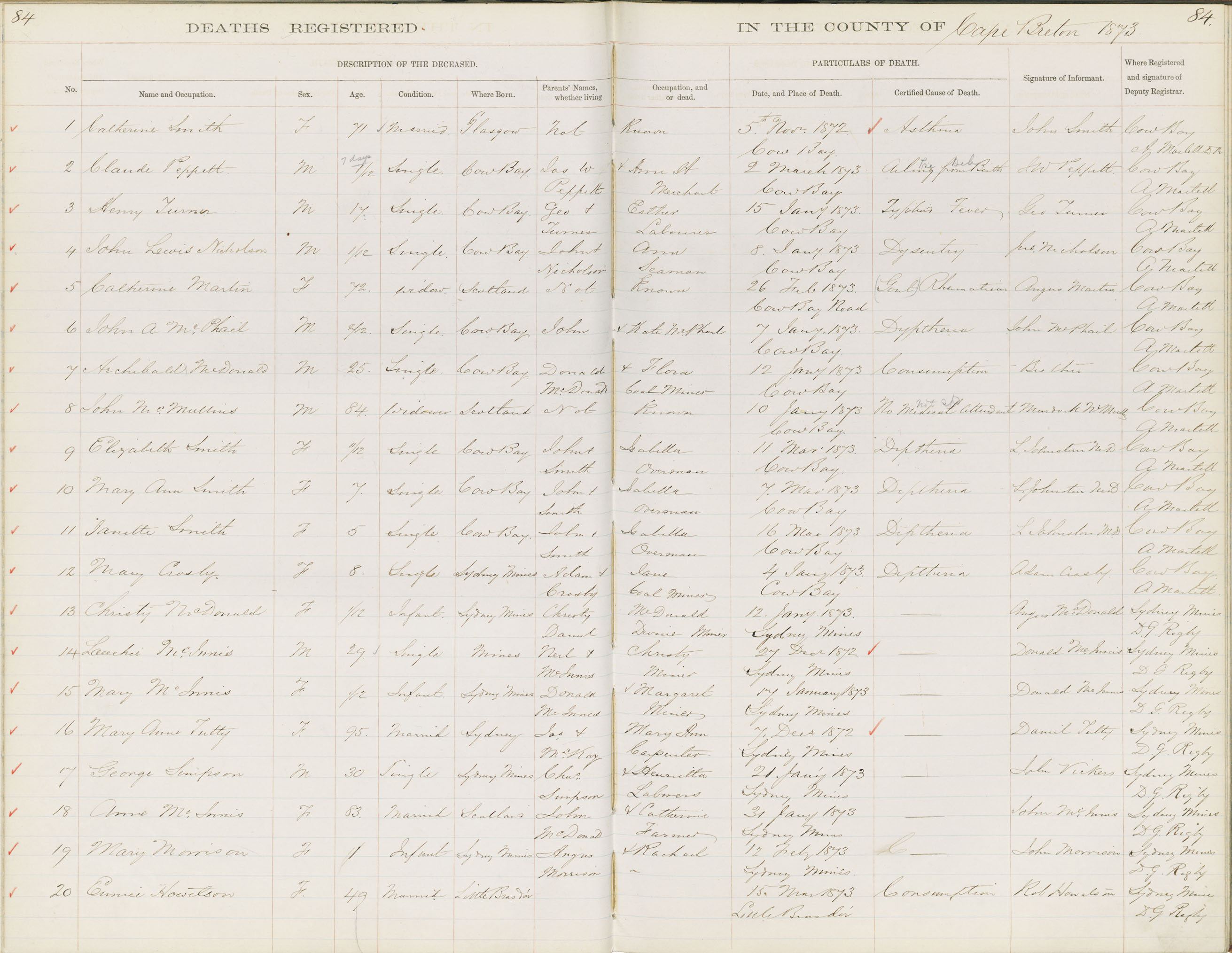 Death Registration: Year: 1872 book: 1803 page: 84 number: 1