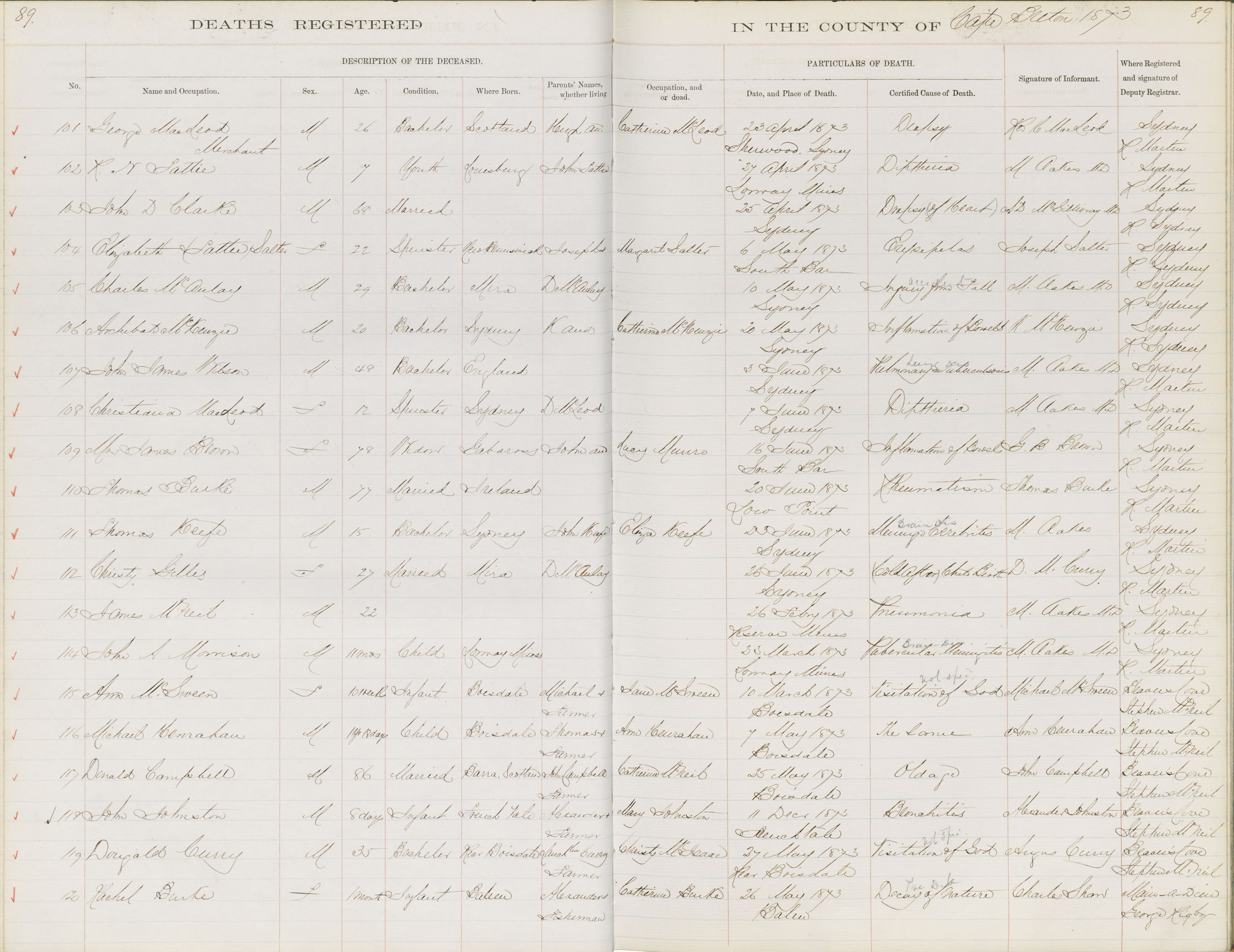 Death Registration: Year: 1873 book: 1803 page: 89 number: 120