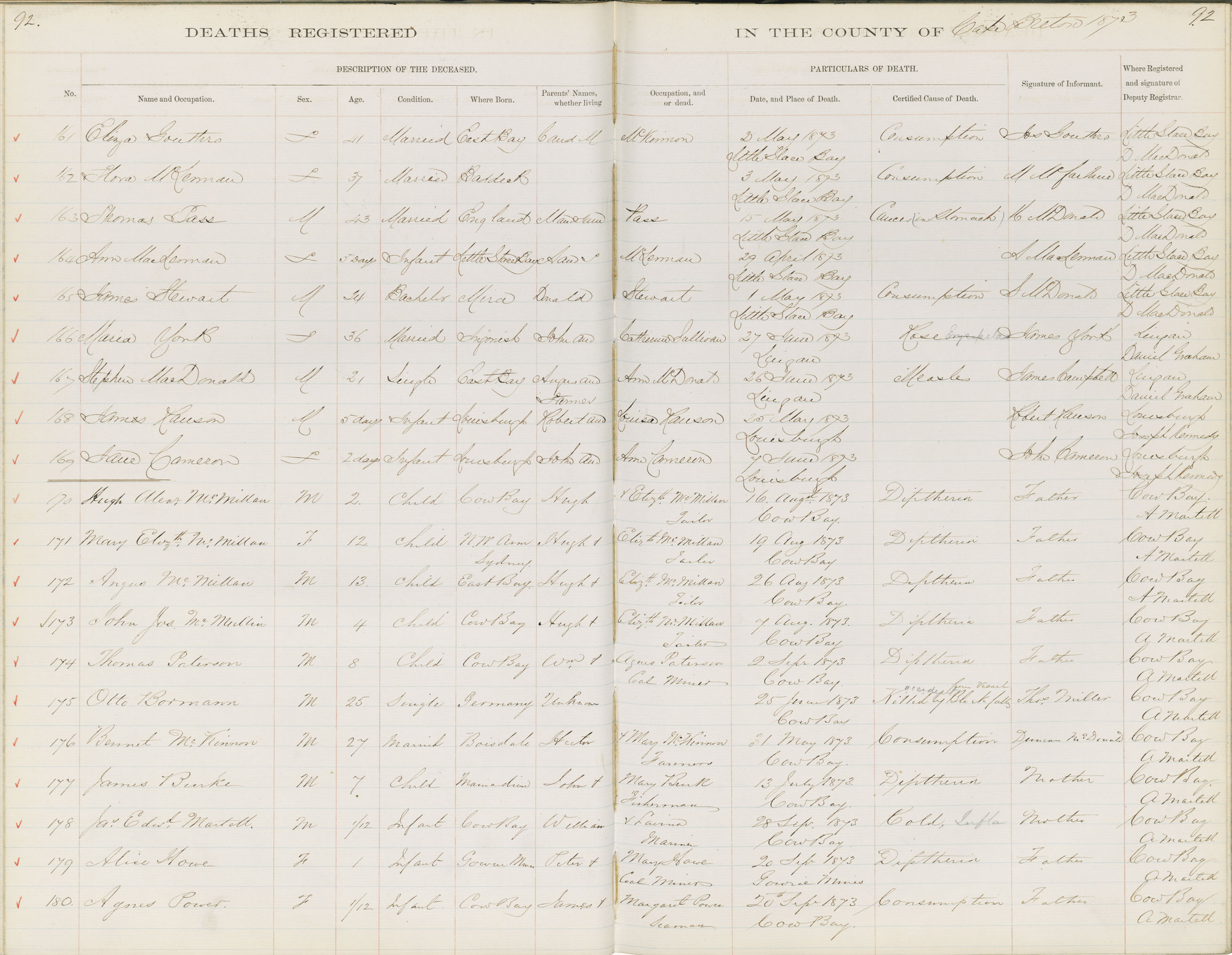 Death Registration: Year: 1873 book: 1803 page: 92 number: 161