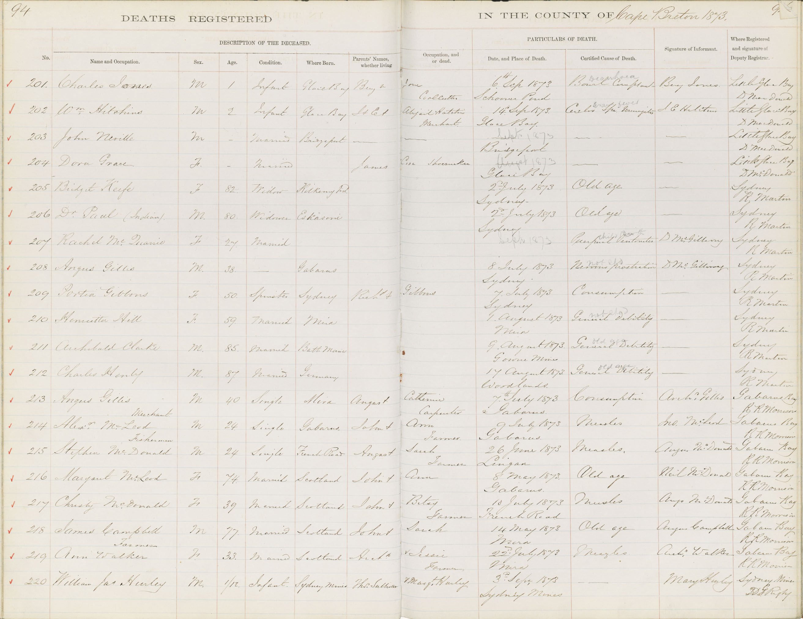 Death Registration: Year: 1873 book: 1803 page: 94 number: 220