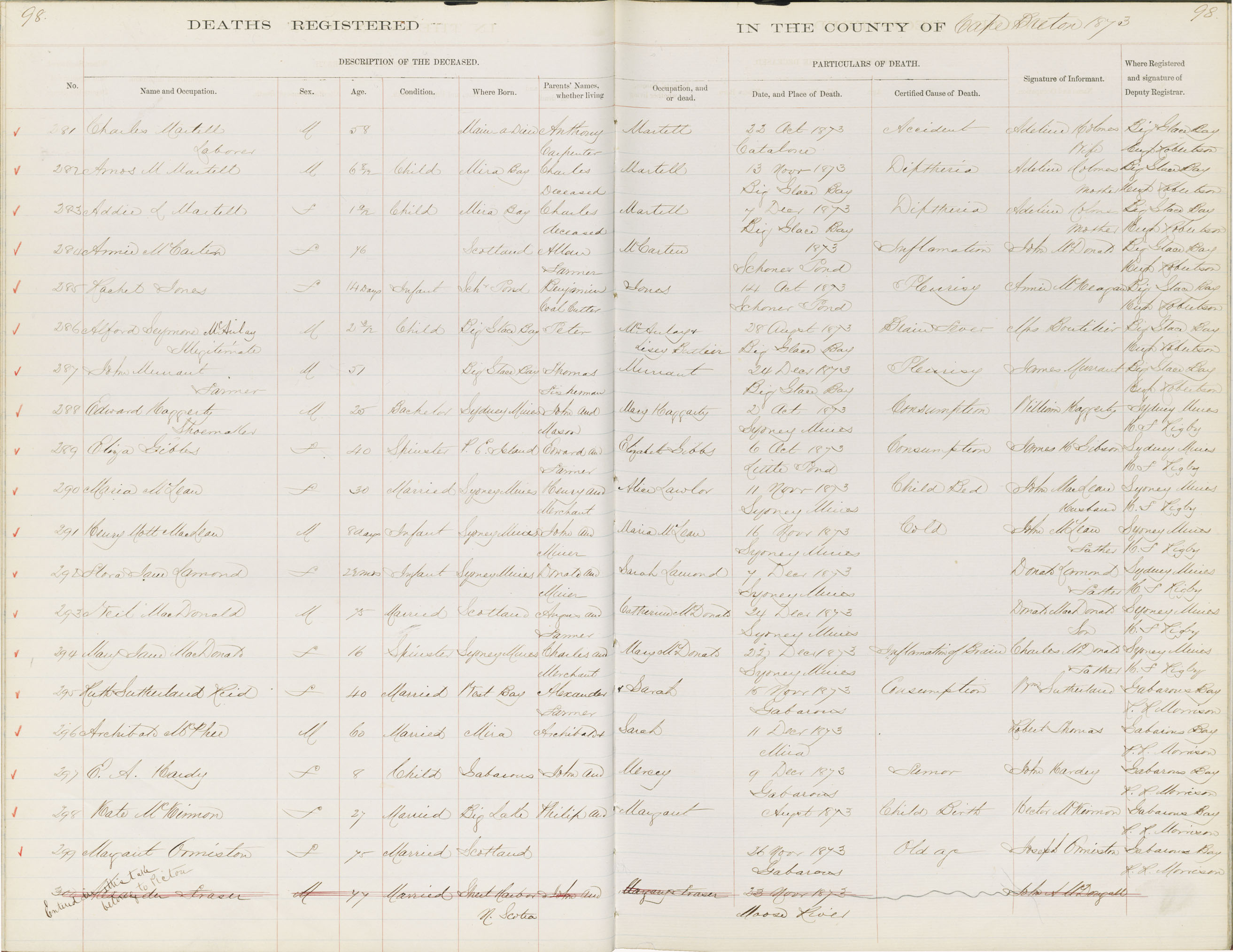 Death Registration: Year: 1873 book: 1803 page: 98 number: 293