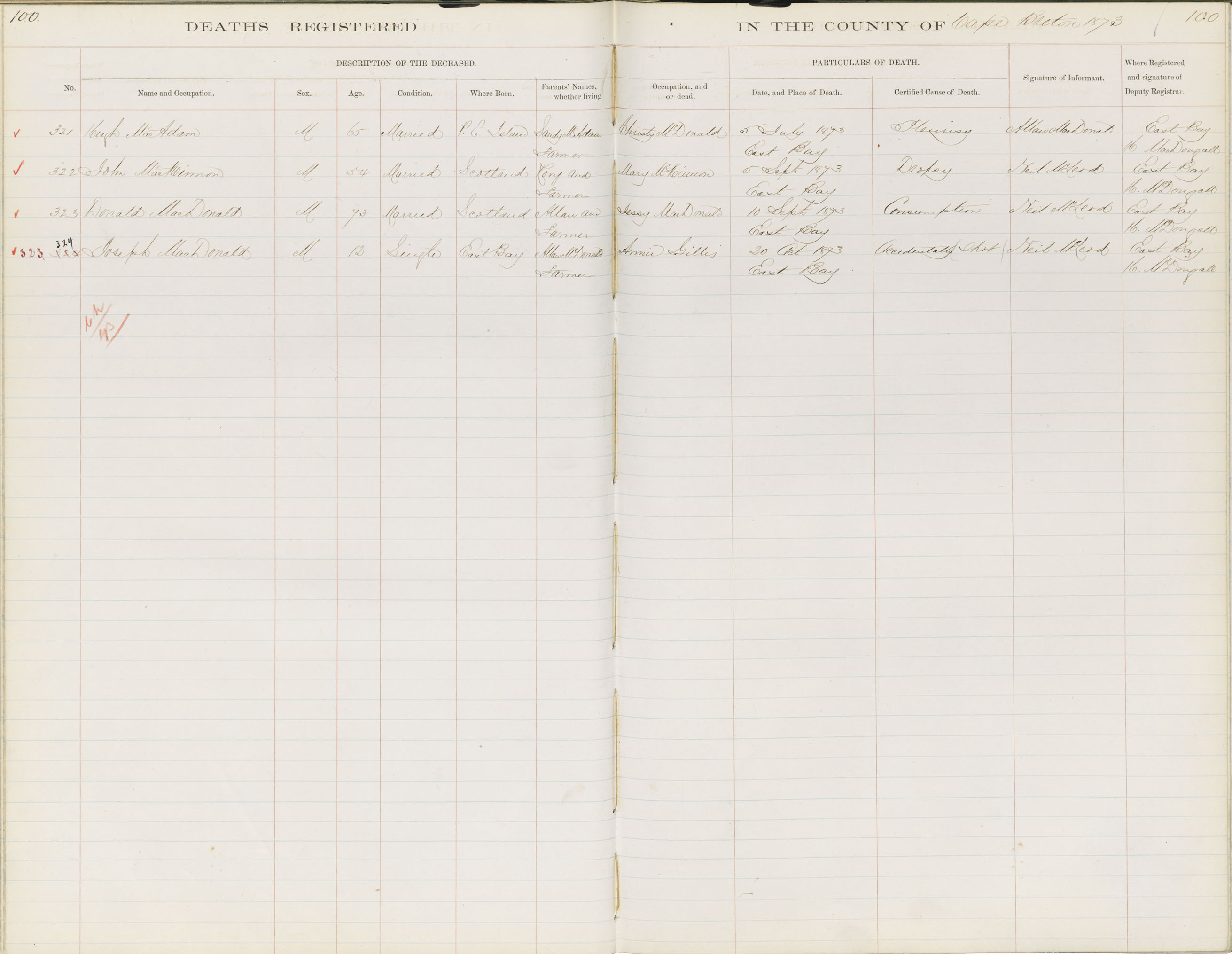Death Registration: Year: 1873 book: 1803 page: 100 number: 324