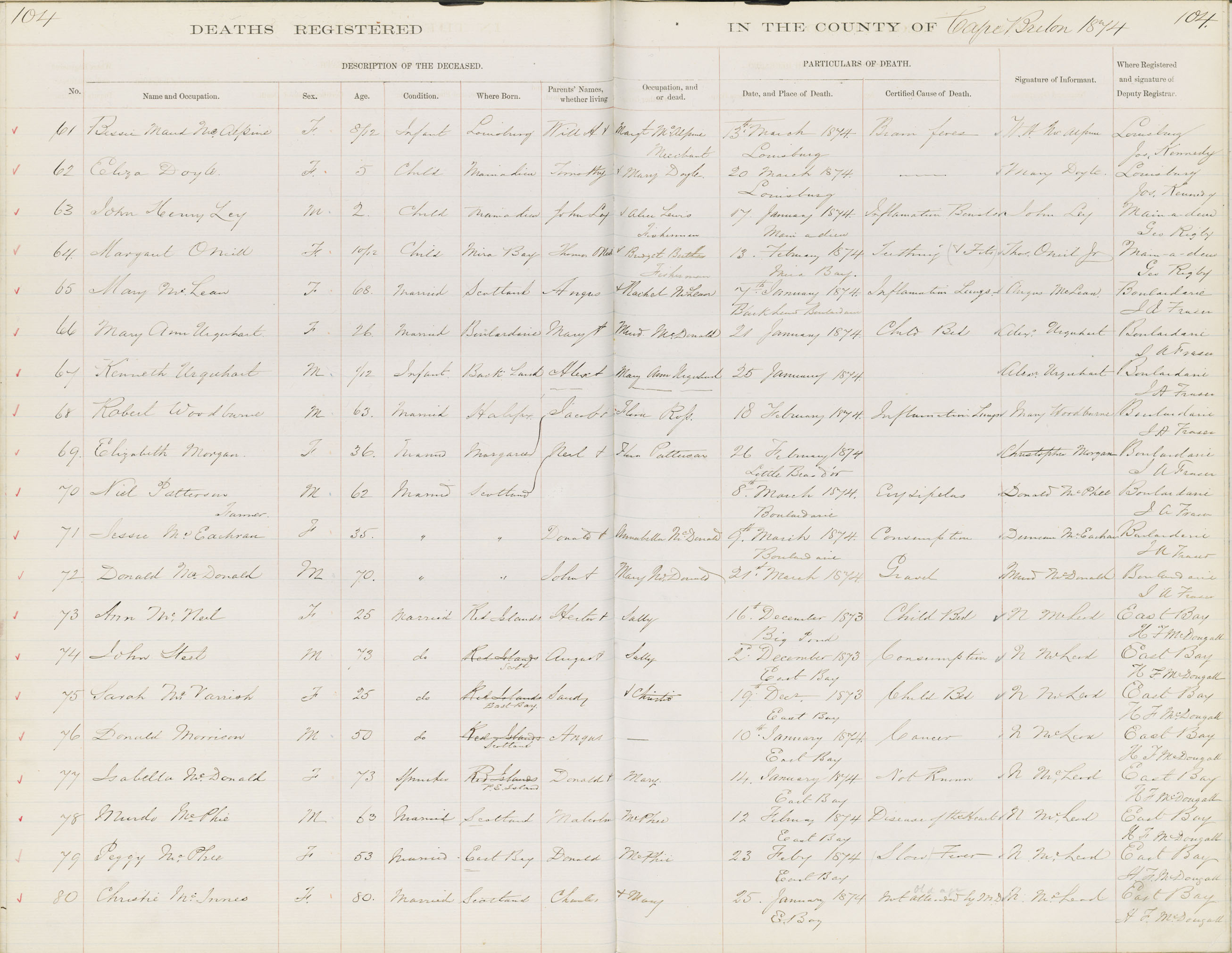Death Registration: Year: 1874 book: 1803 page: 104 number: 76