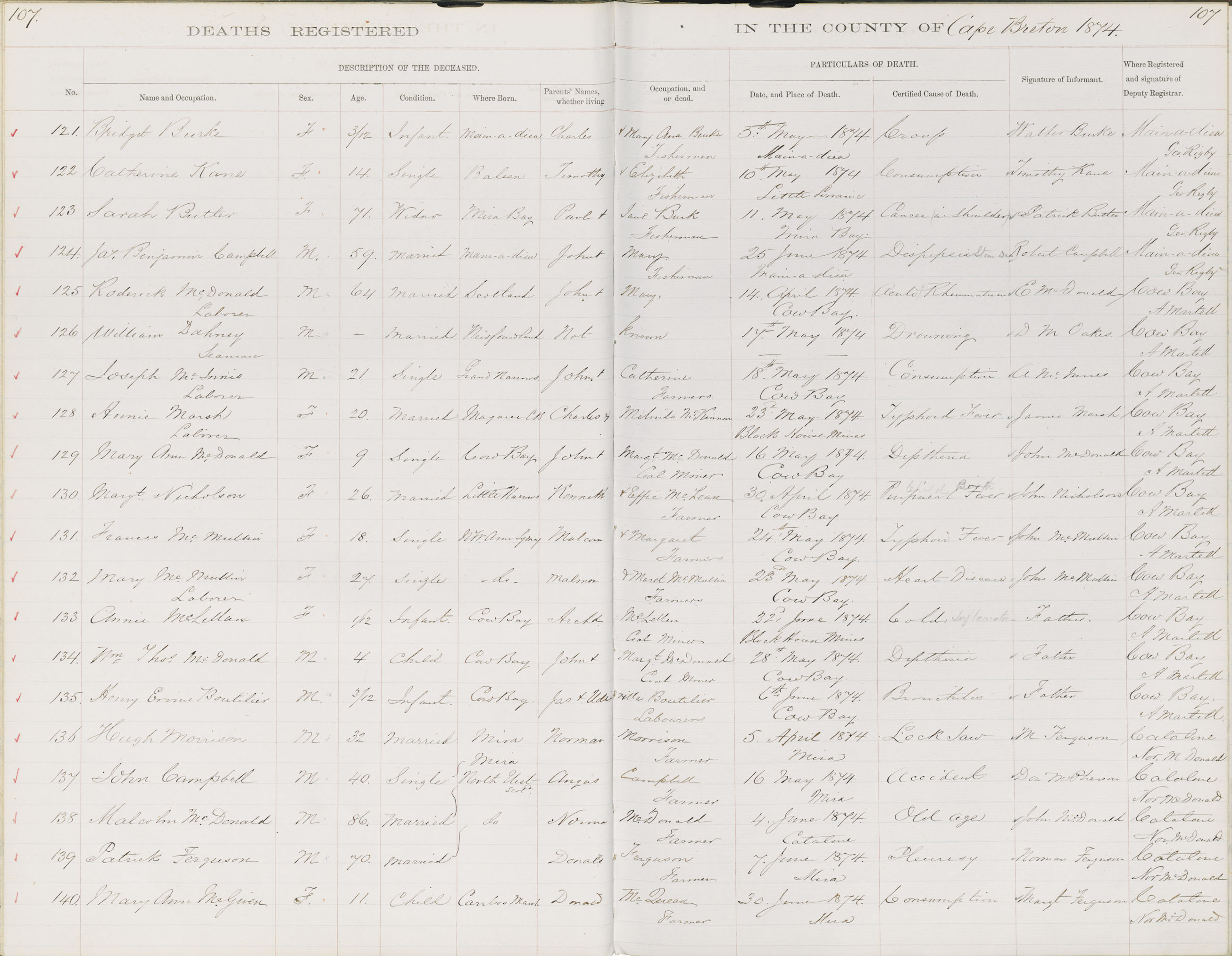 Death Registration: Year: 1874 book: 1803 page: 107 number: 121