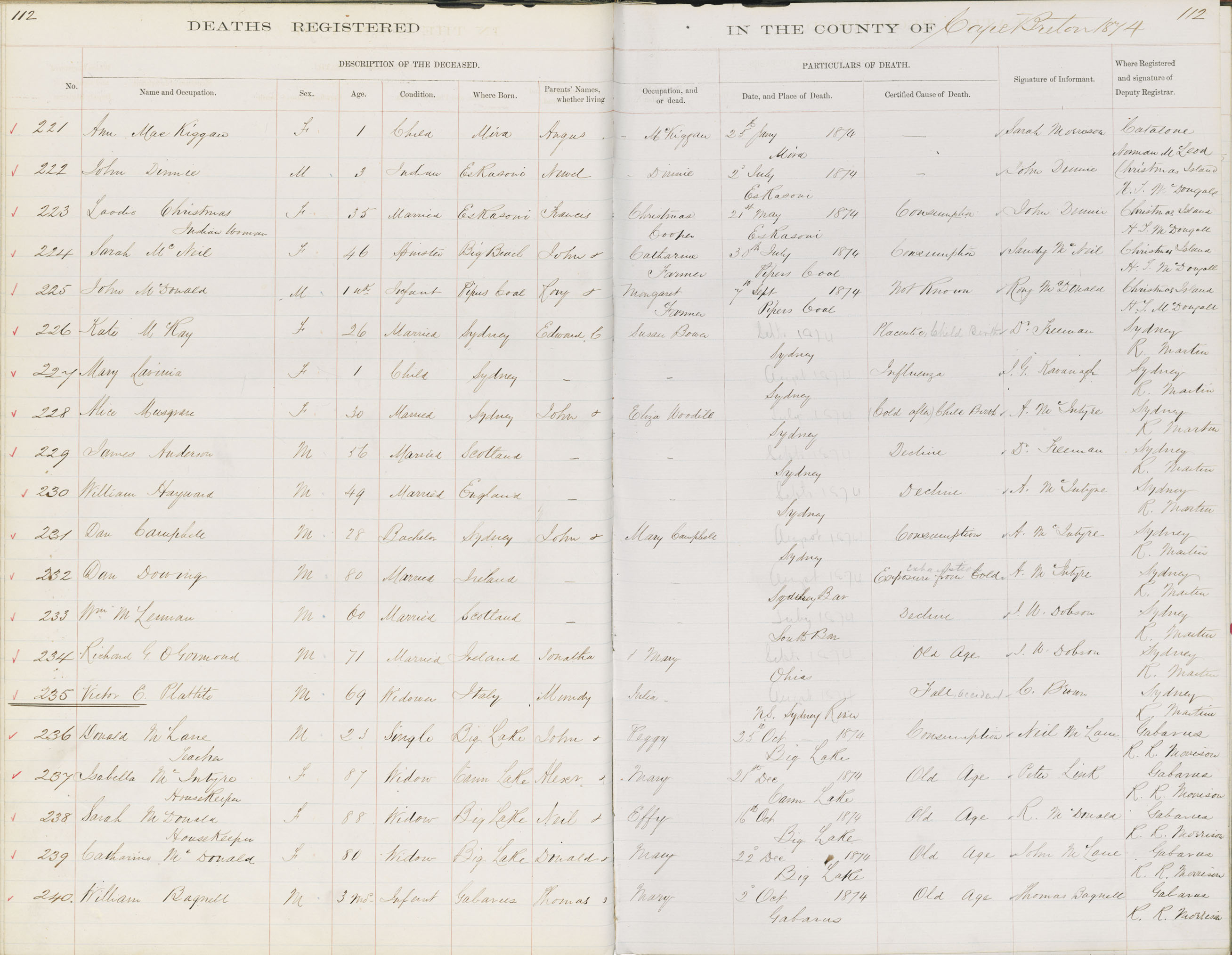 Death Registration: Year: 1874 book: 1803 page: 112 number: 221