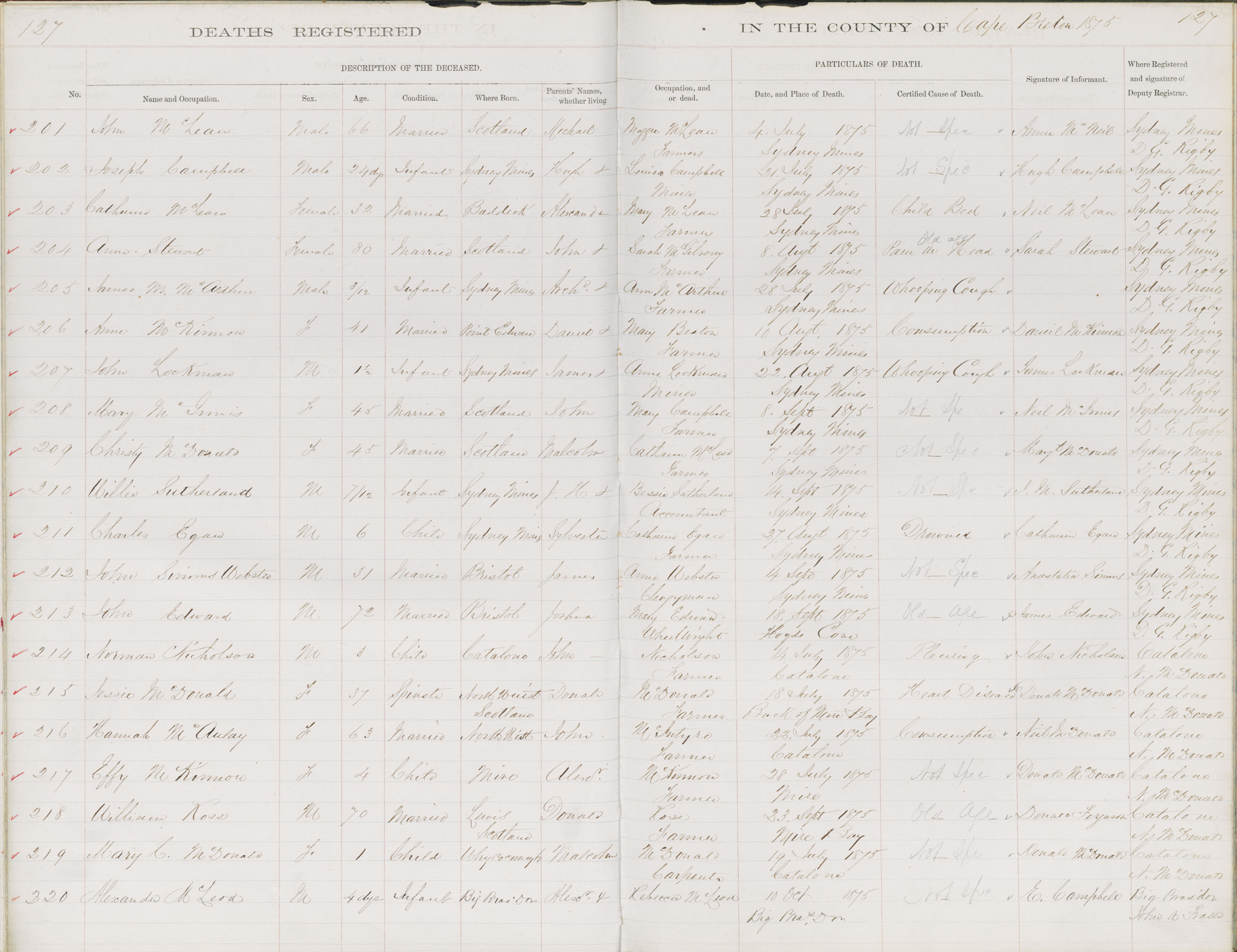 Death Registration: Year: 1875 book: 1803 page: 127 number: 218