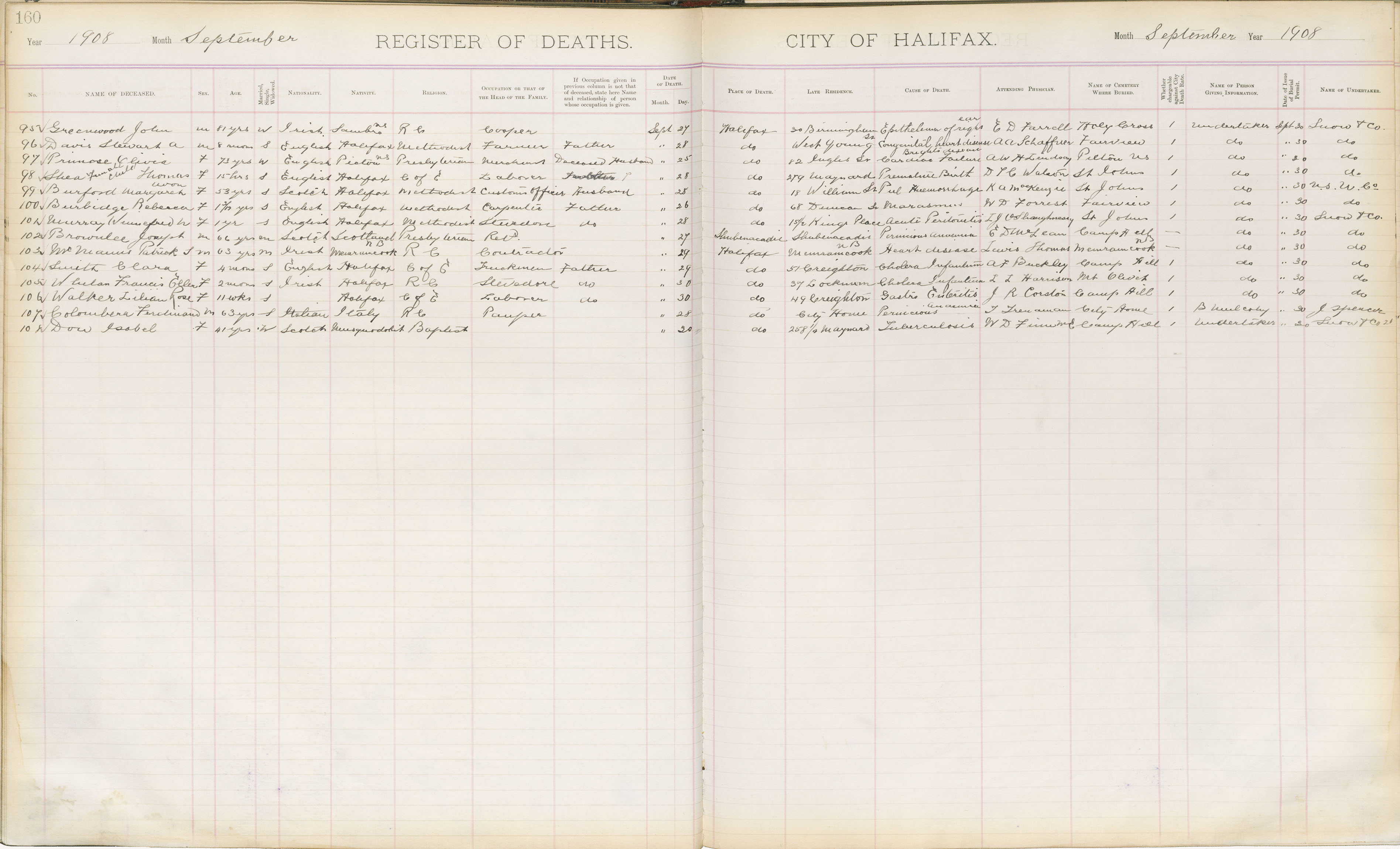 Death Registration: Year: 1908 book: 1908 page: 160 number: 95