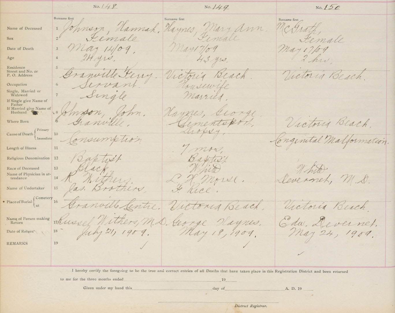 Female Death Registration: Year: 1909 book: 1 page: 25 number: 150