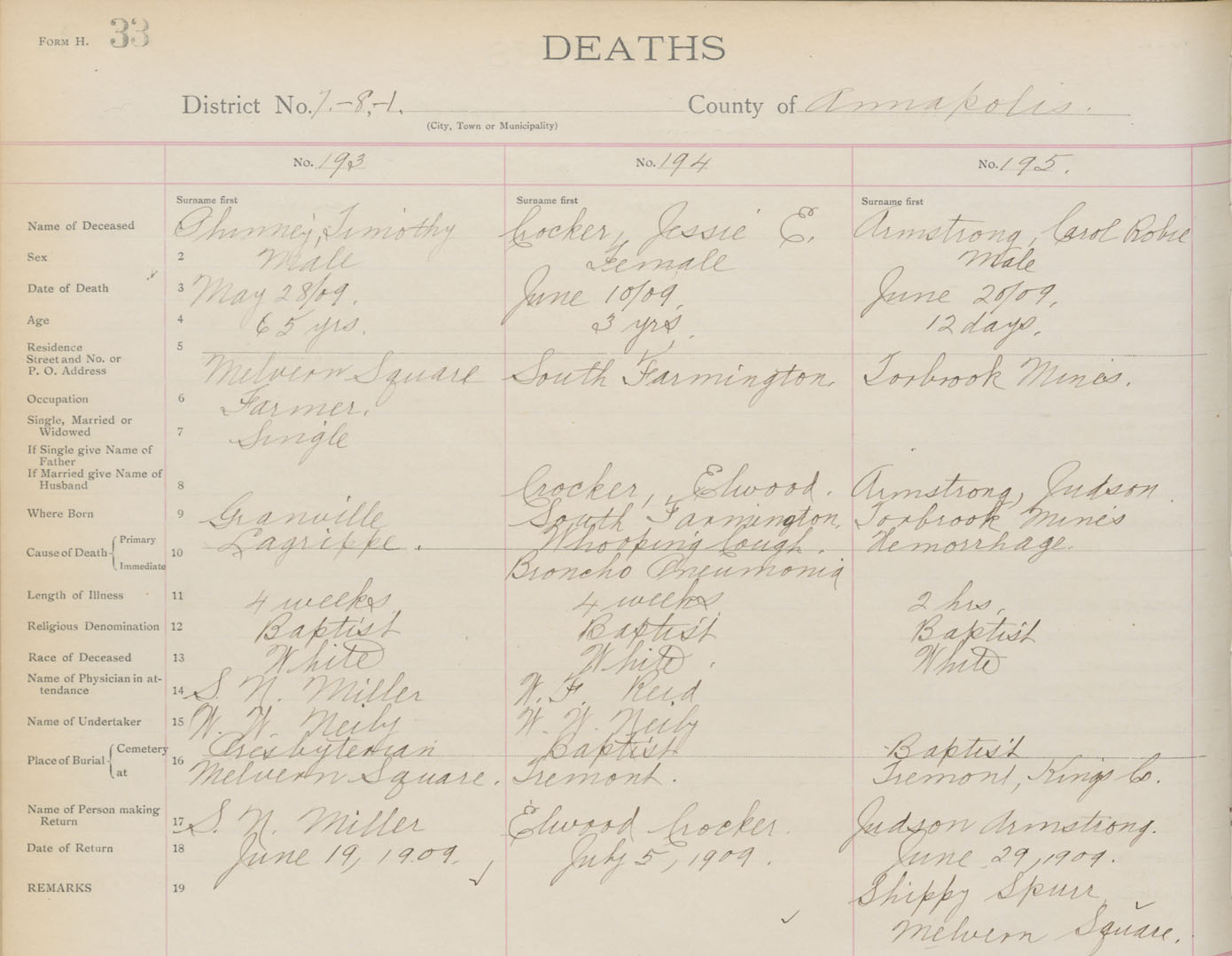 Death Registration: Year: 1909 book: 1 page: 33 number: 195
