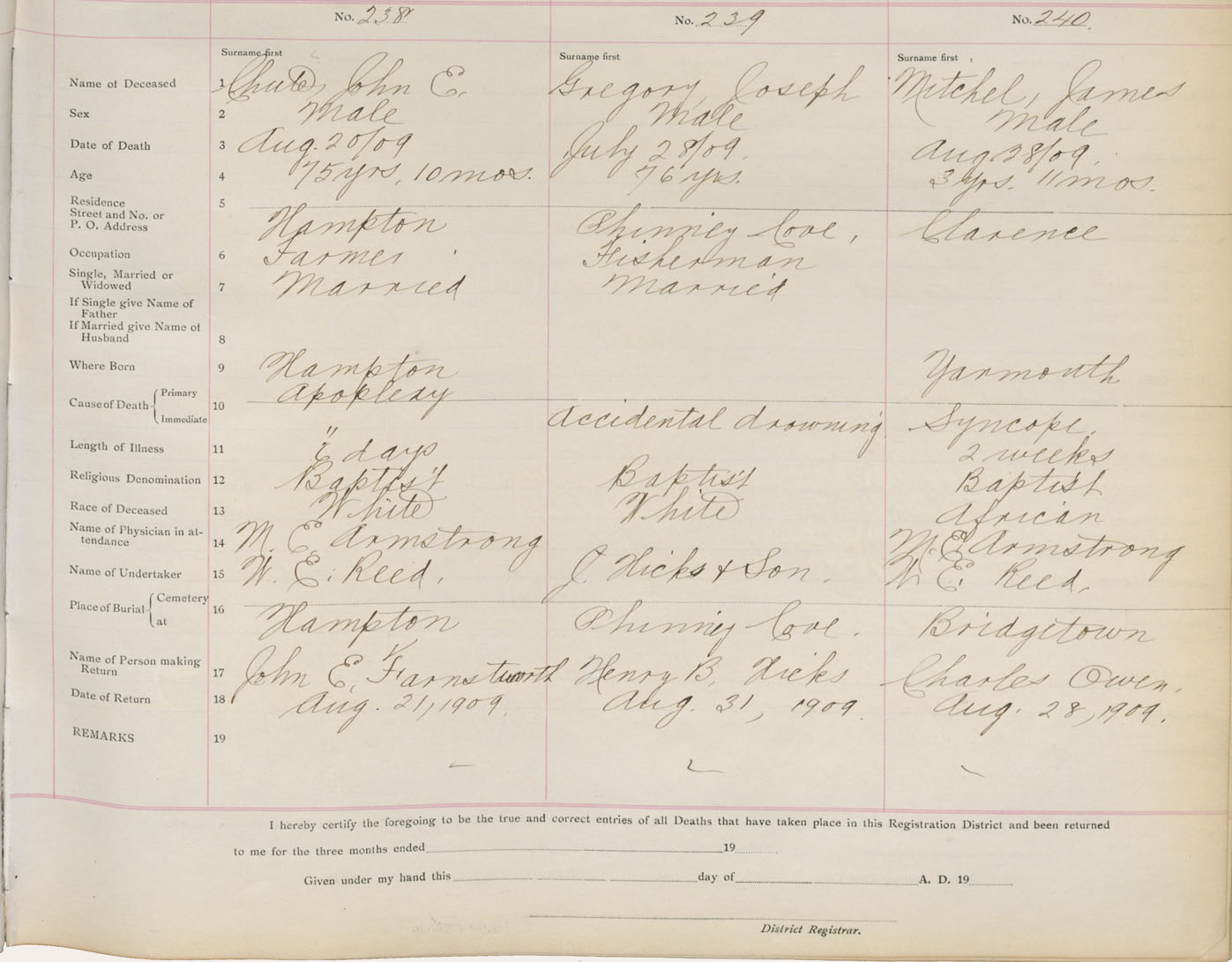 Death Registration: Year: 1909 book: 1 page: 40 number: 240