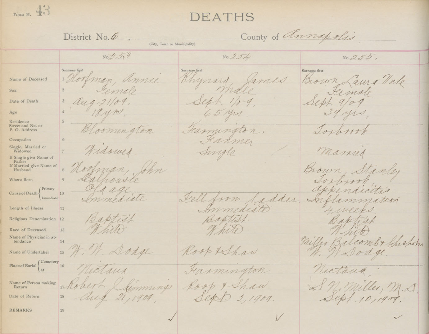 Death Registration: Year: 1909 book: 1 page: 43 number: 255