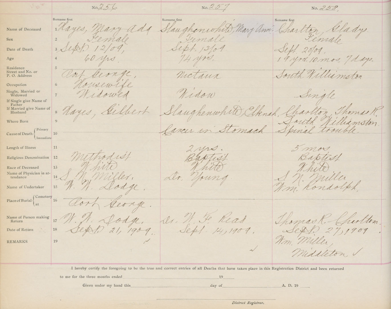 Death Registration: Year: 1909 book: 1 page: 43 number: 258