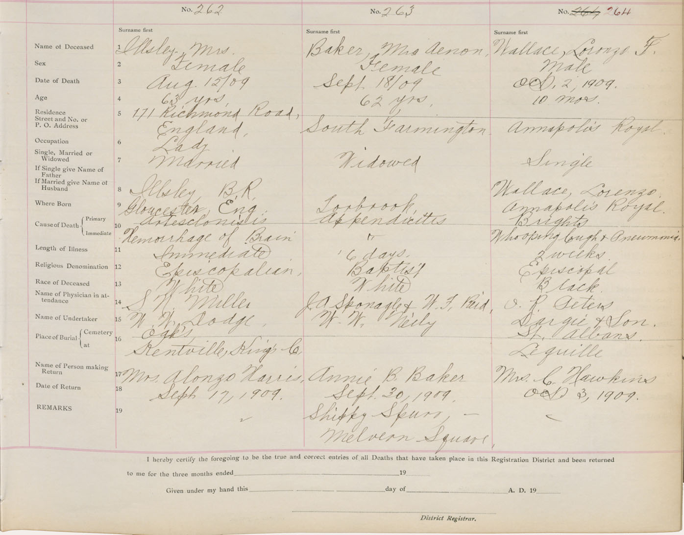Death Registration: Year: 1909 book: 1 page: 44 number: 264
