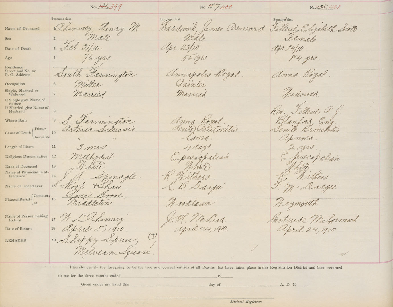 Death Registration: Year: 1910 book: 1 page: 67 number: 399