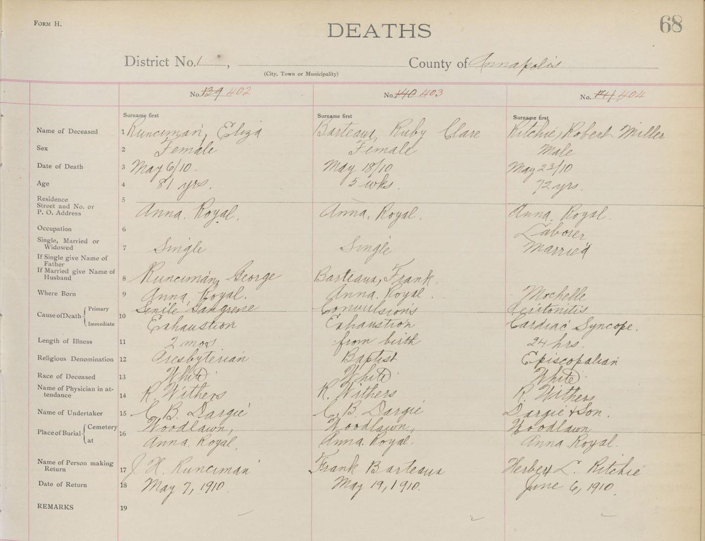 Death Registration: Year: 1910 book: 1 page: 68 number: 402